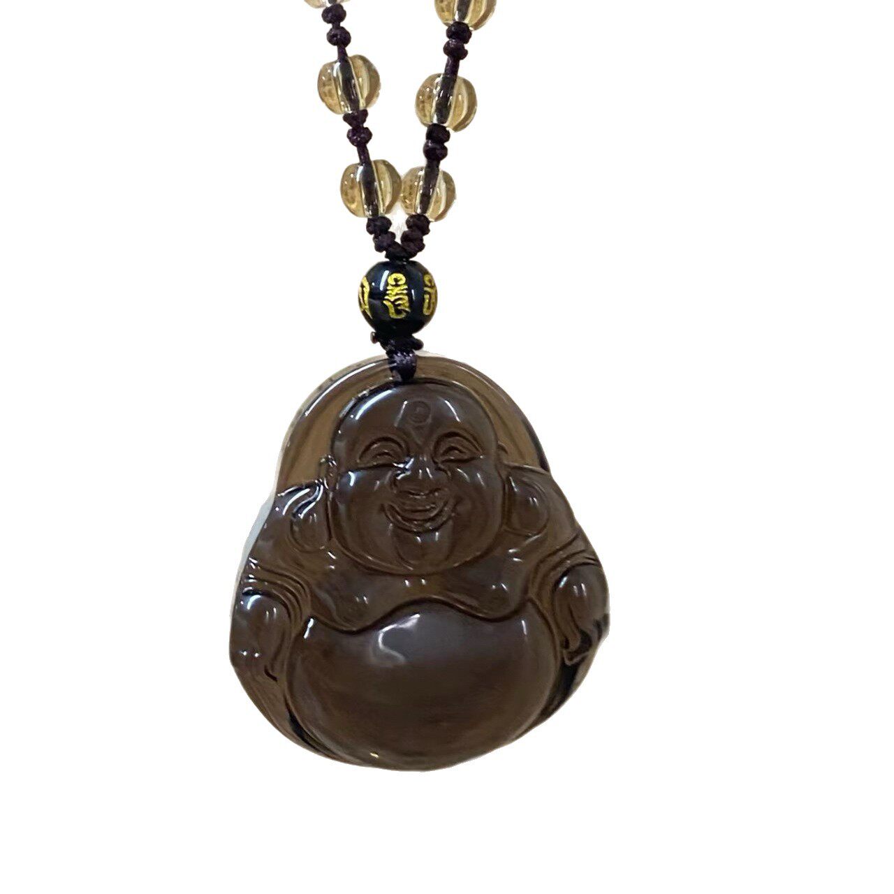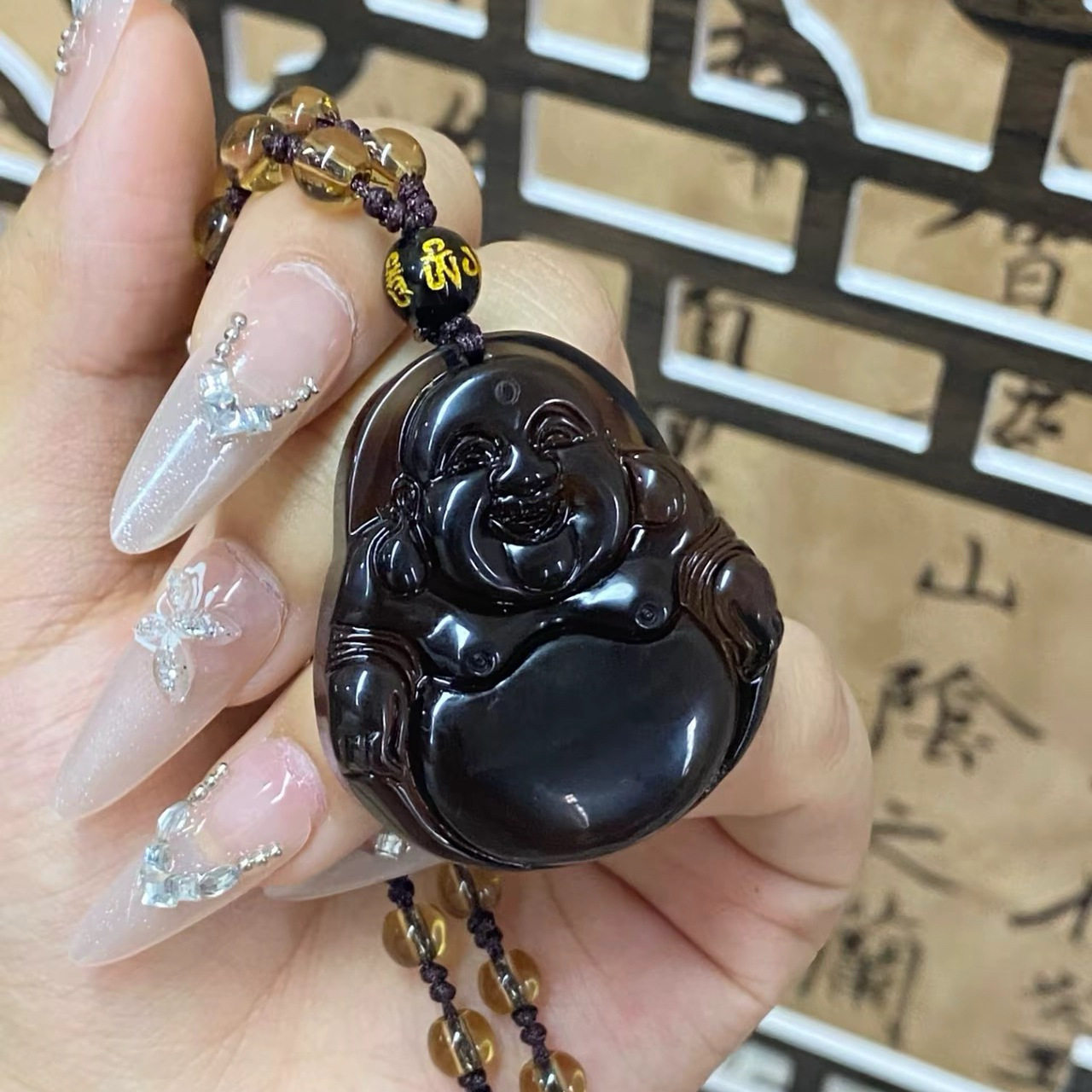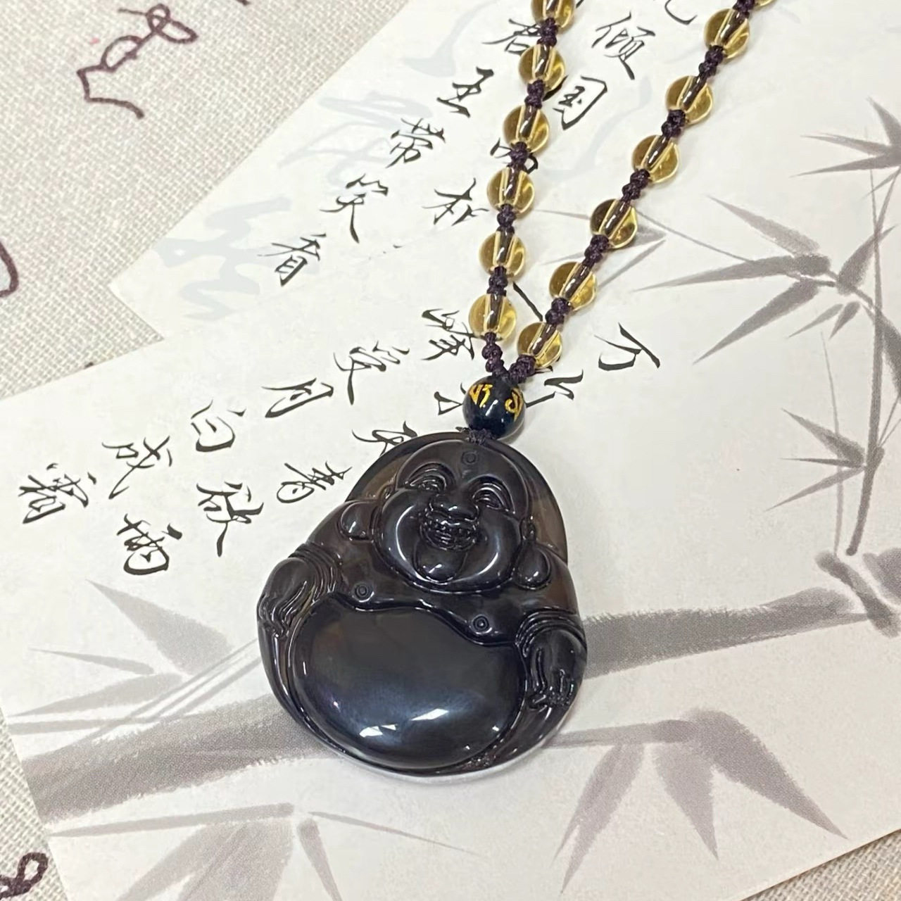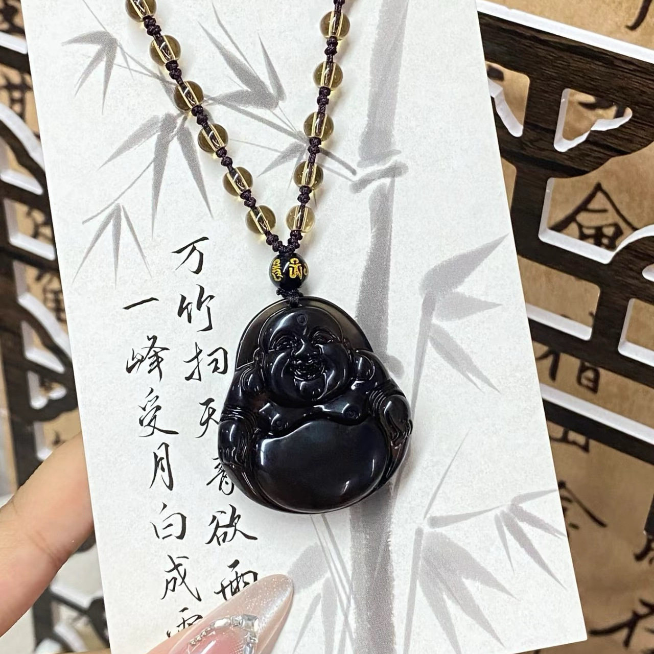 厂家批发天然黑曜石吊坠冰种弥勒佛笑佛项坠水晶项链闺蜜朋友