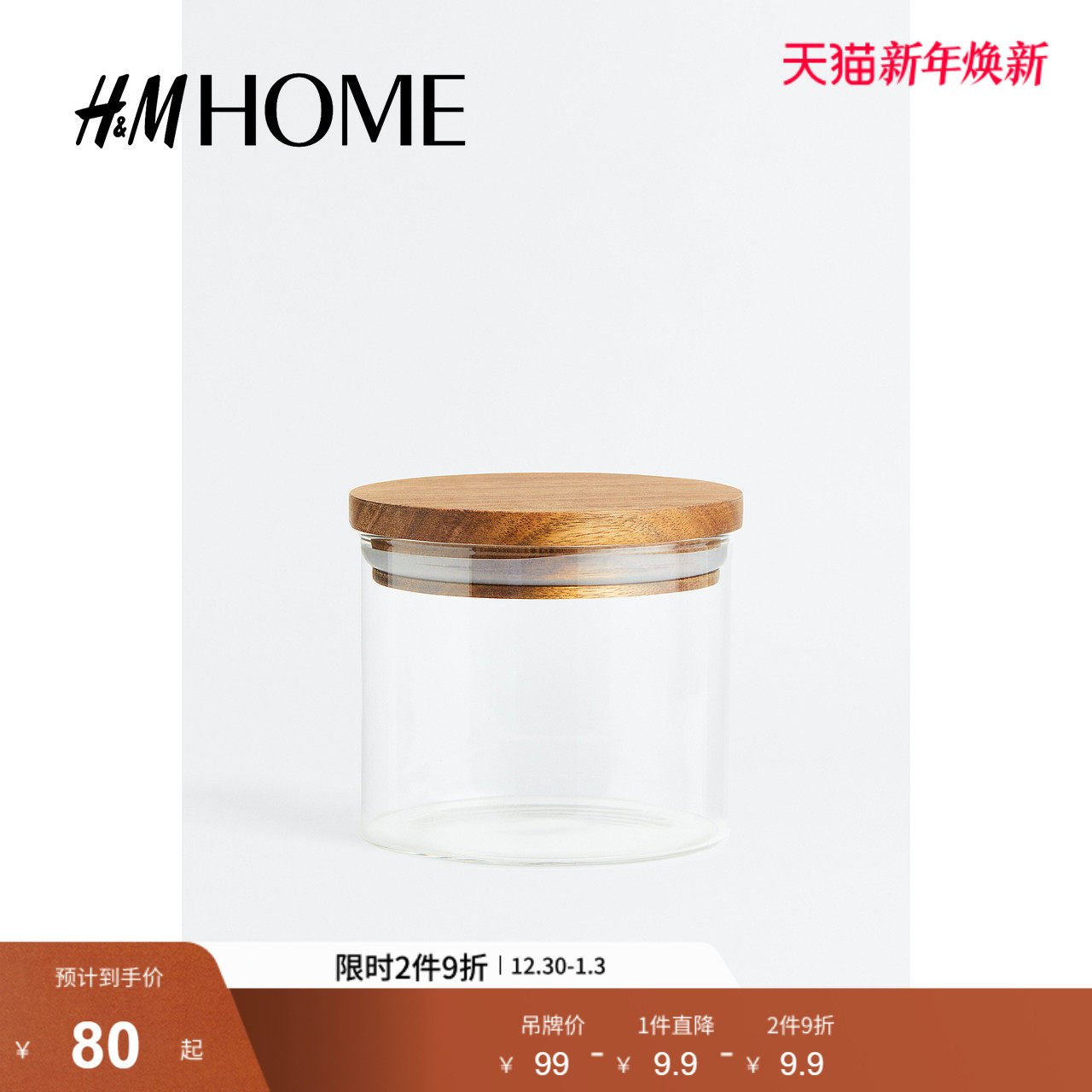 HM HOME餐饮具储物罐透明玻璃家用收纳配紧固木盖玻璃瓶1136273