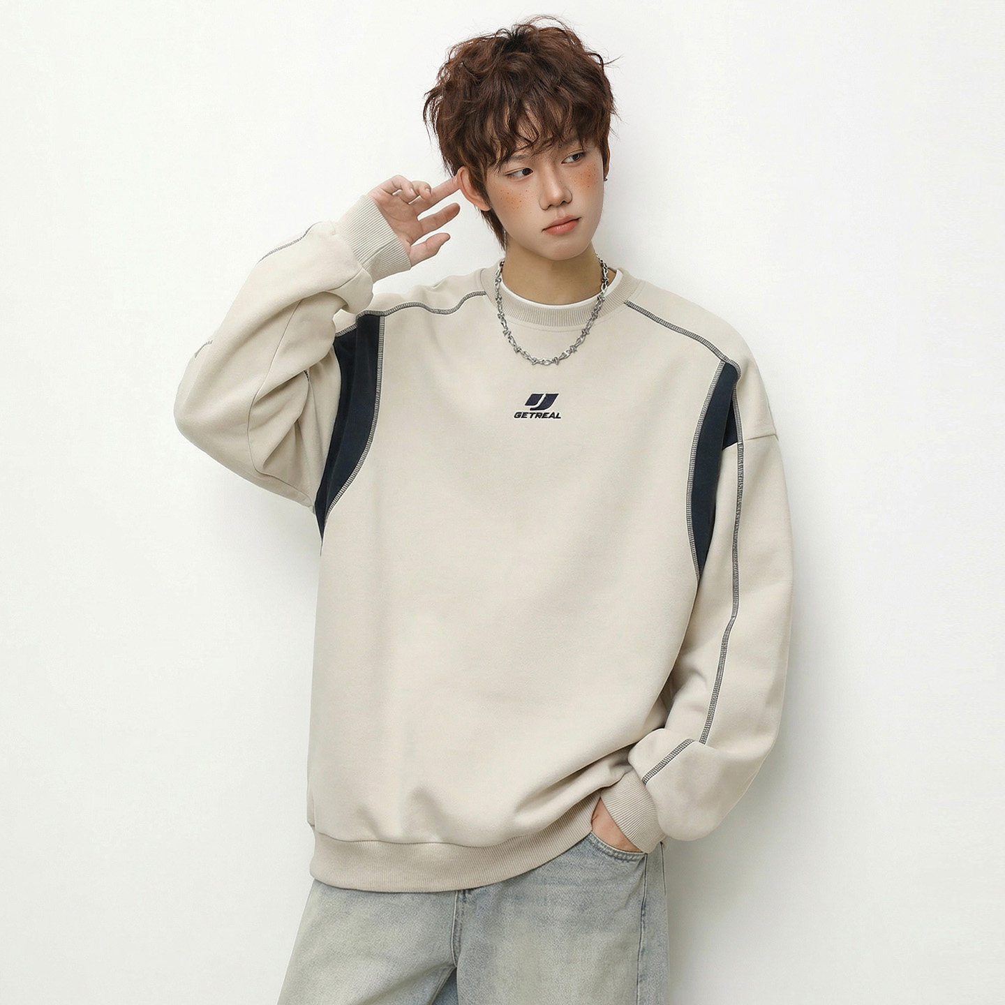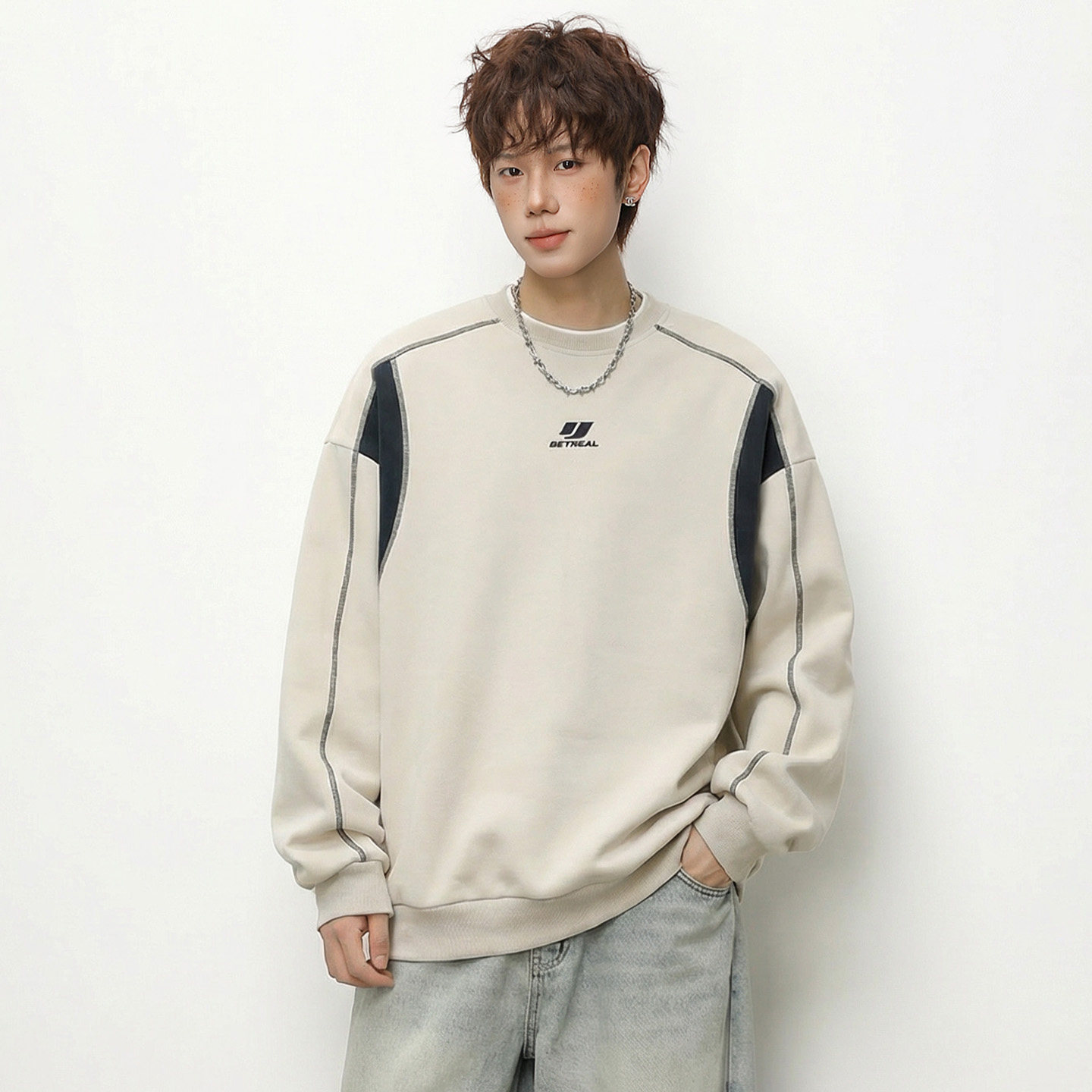 OFF-UP 复古运动风撞色拼接圆领卫衣春季新款宽松百搭套头上衣潮
