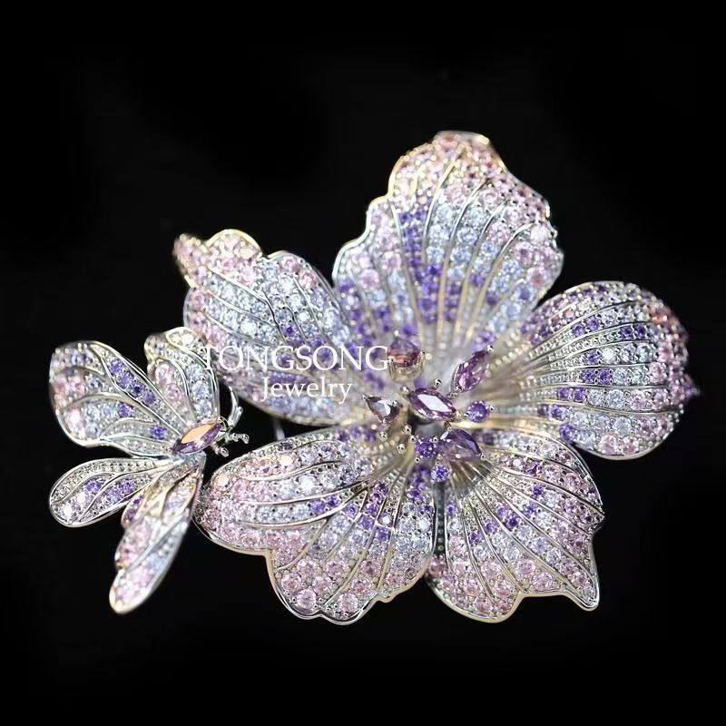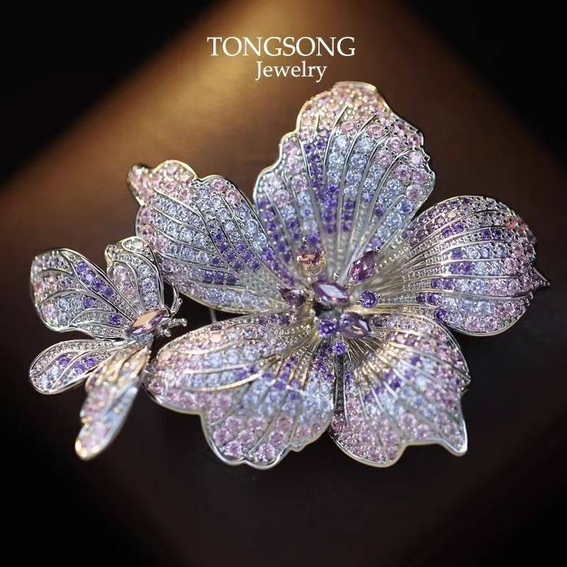 璀璨蝶恋花山茶花胸针微镶紫奢华大衣优雅西装配饰晚宴胸花