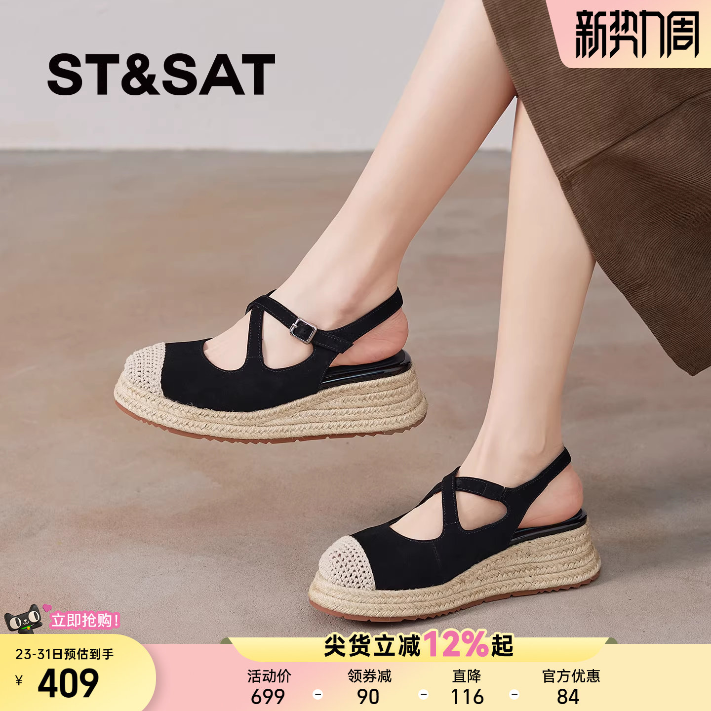 包头罗马凉鞋女夏厚底2026年新款法式编织平底猪笼大码女鞋41到43