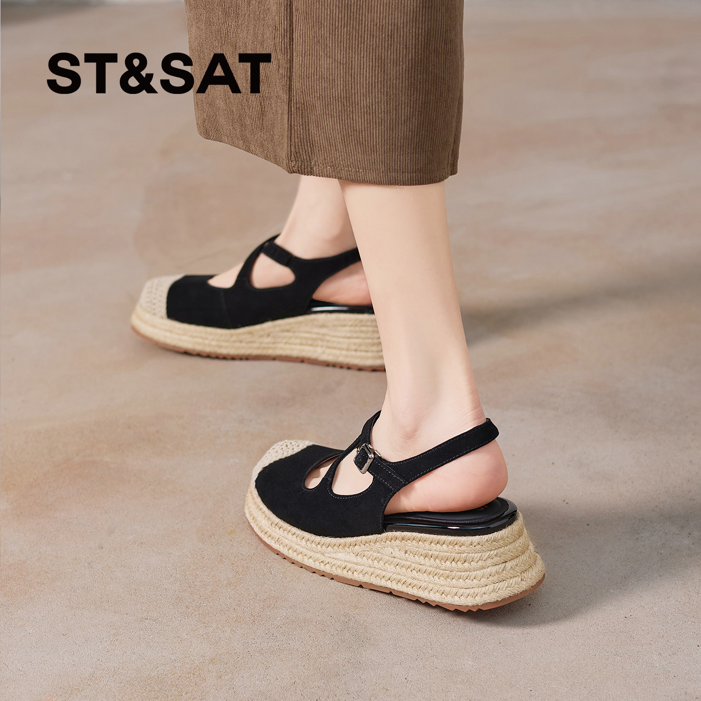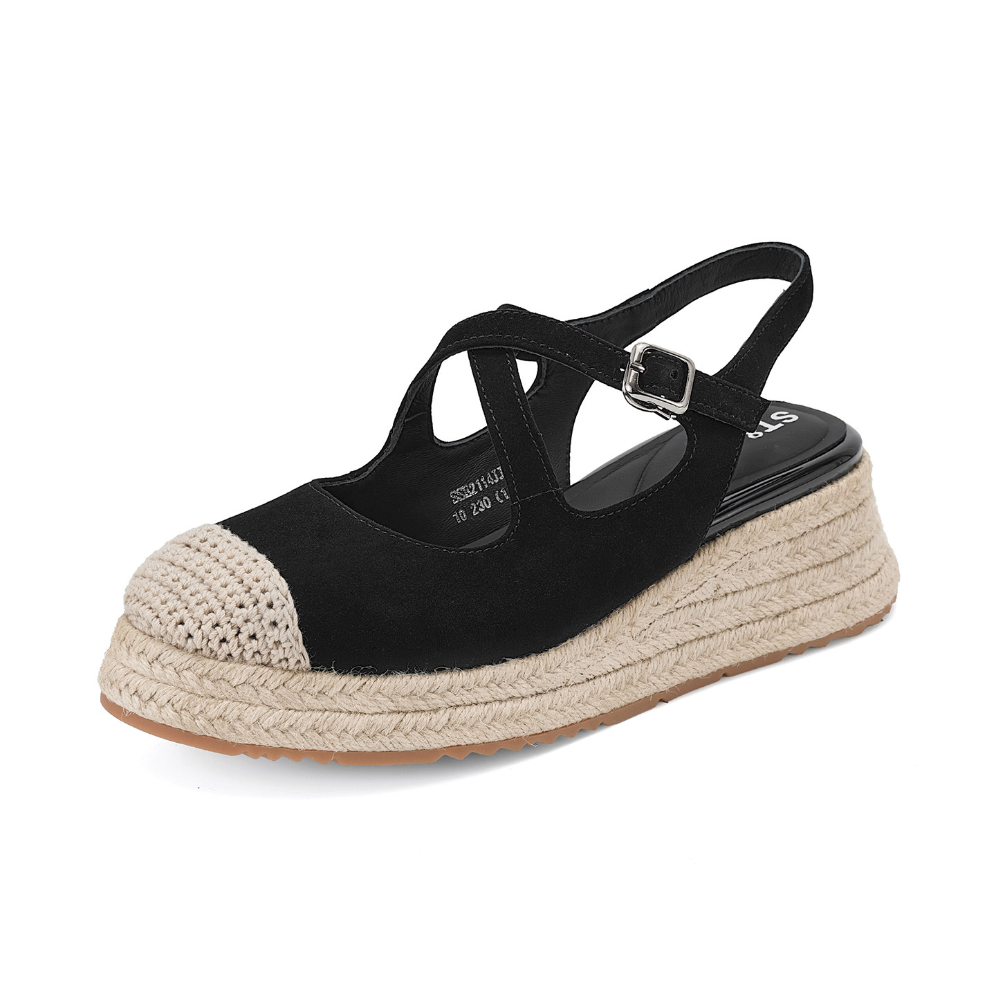 星期六厚底圆头凉鞋女夏黑色包头坡跟小个子松糕底玛丽珍鞋百搭