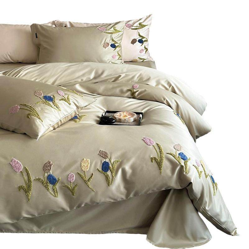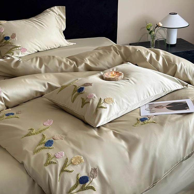 小清新毛巾绣100S长绒棉贡缎四件套裸睡纯棉全棉床单被套床上用品