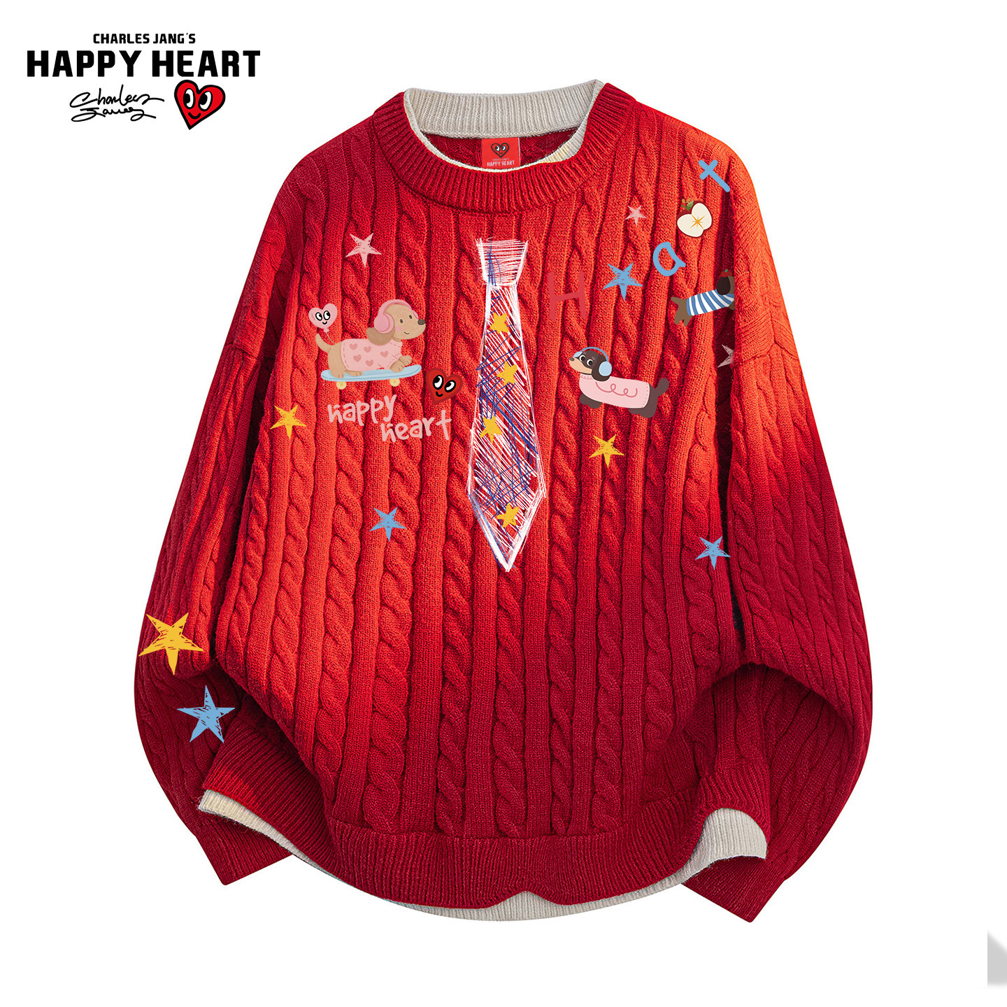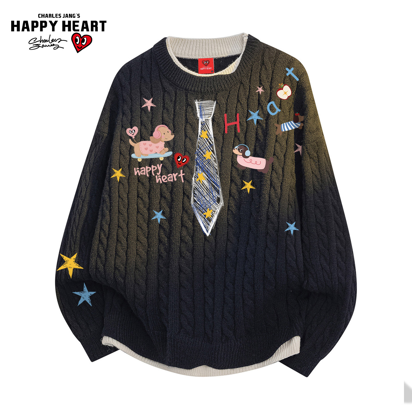 查尔斯桃心圆领毛衣男女冬季假两件拼色小狗领带印花情侣针织上衣