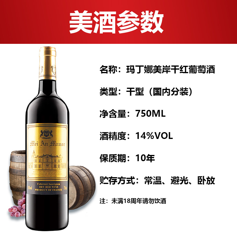 进口14度红酒美岸干红葡萄酒750ml多规格