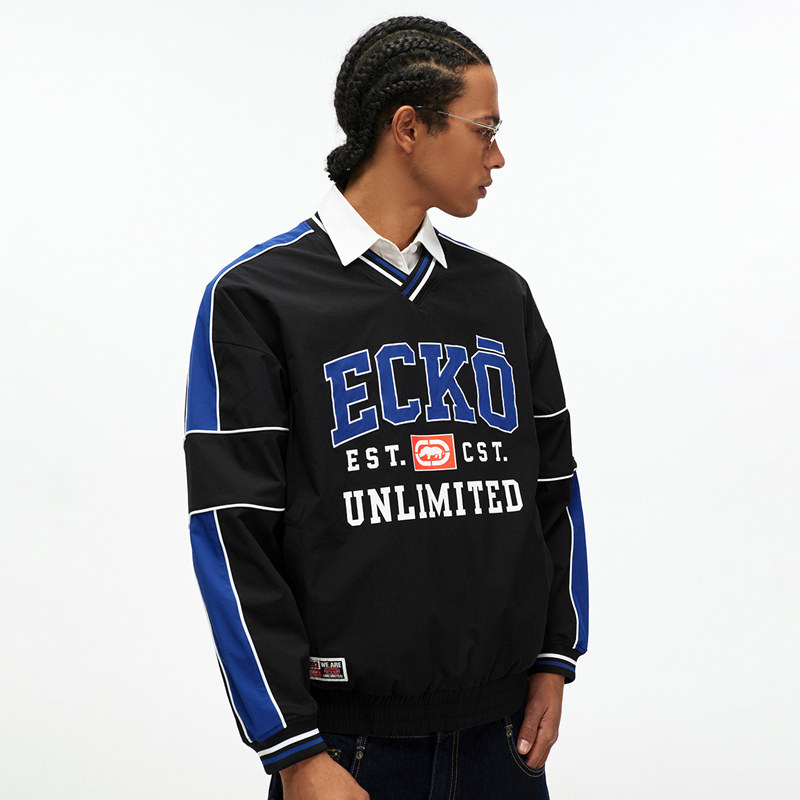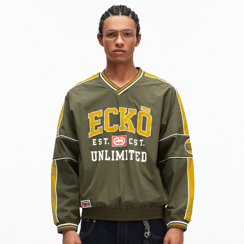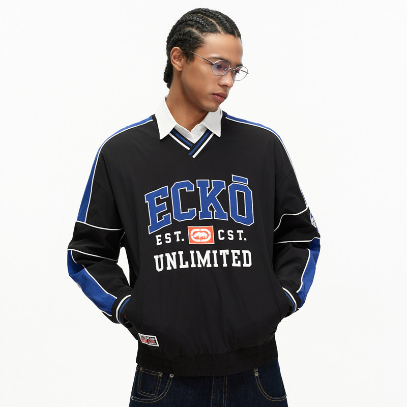 ecko红犀牛 贴布刺绣复古运动V领卫衣男女情侣装2026春季新款上衣