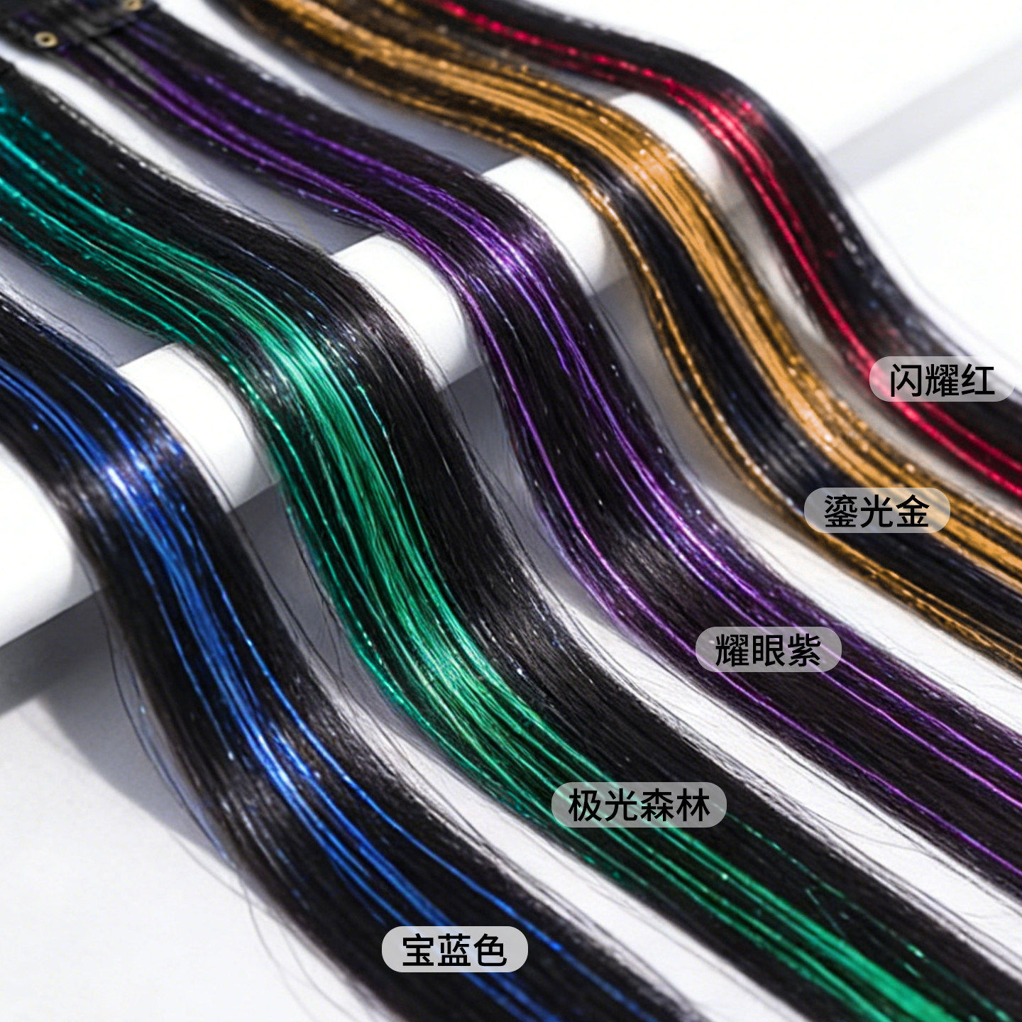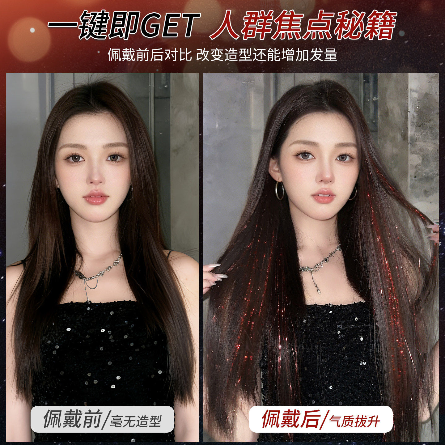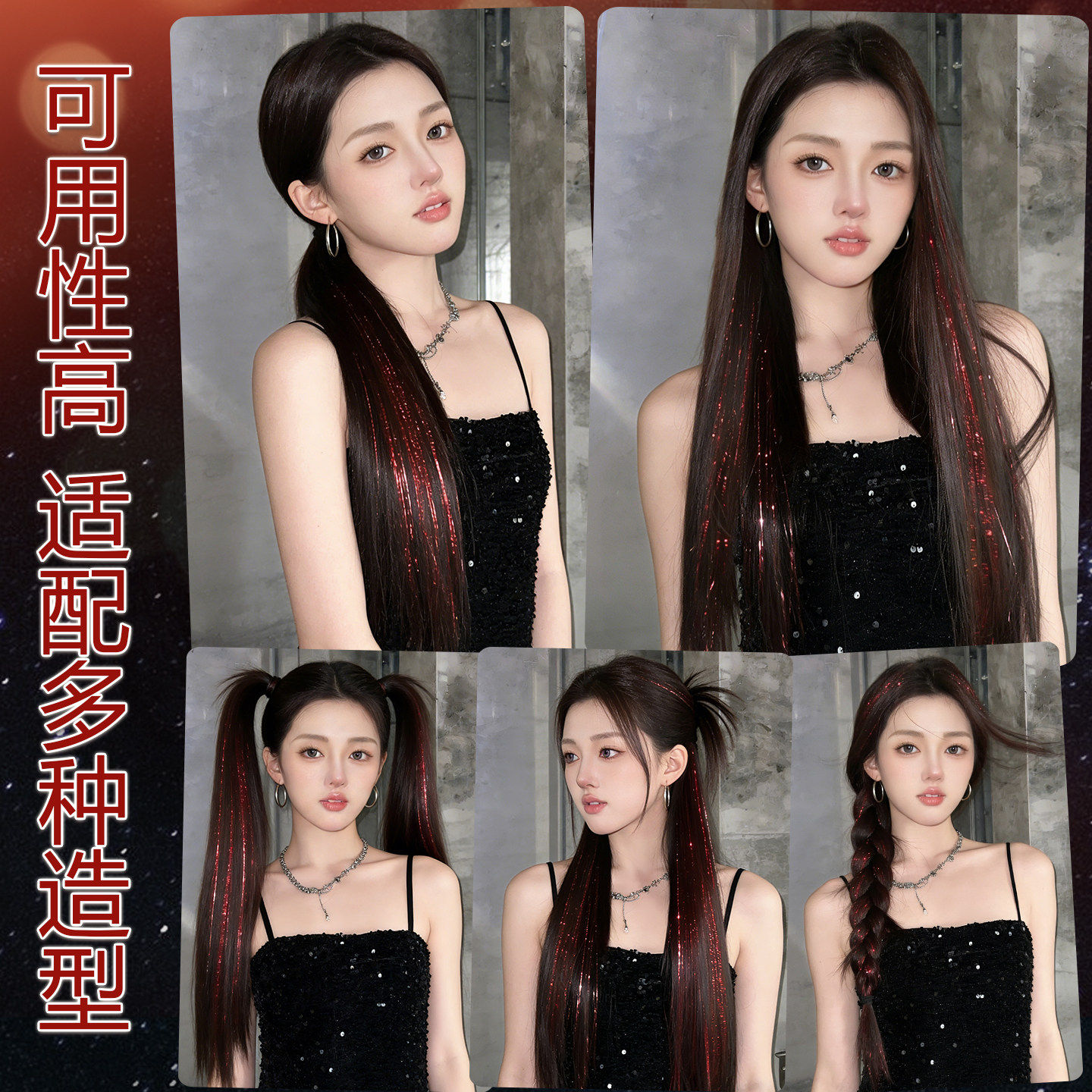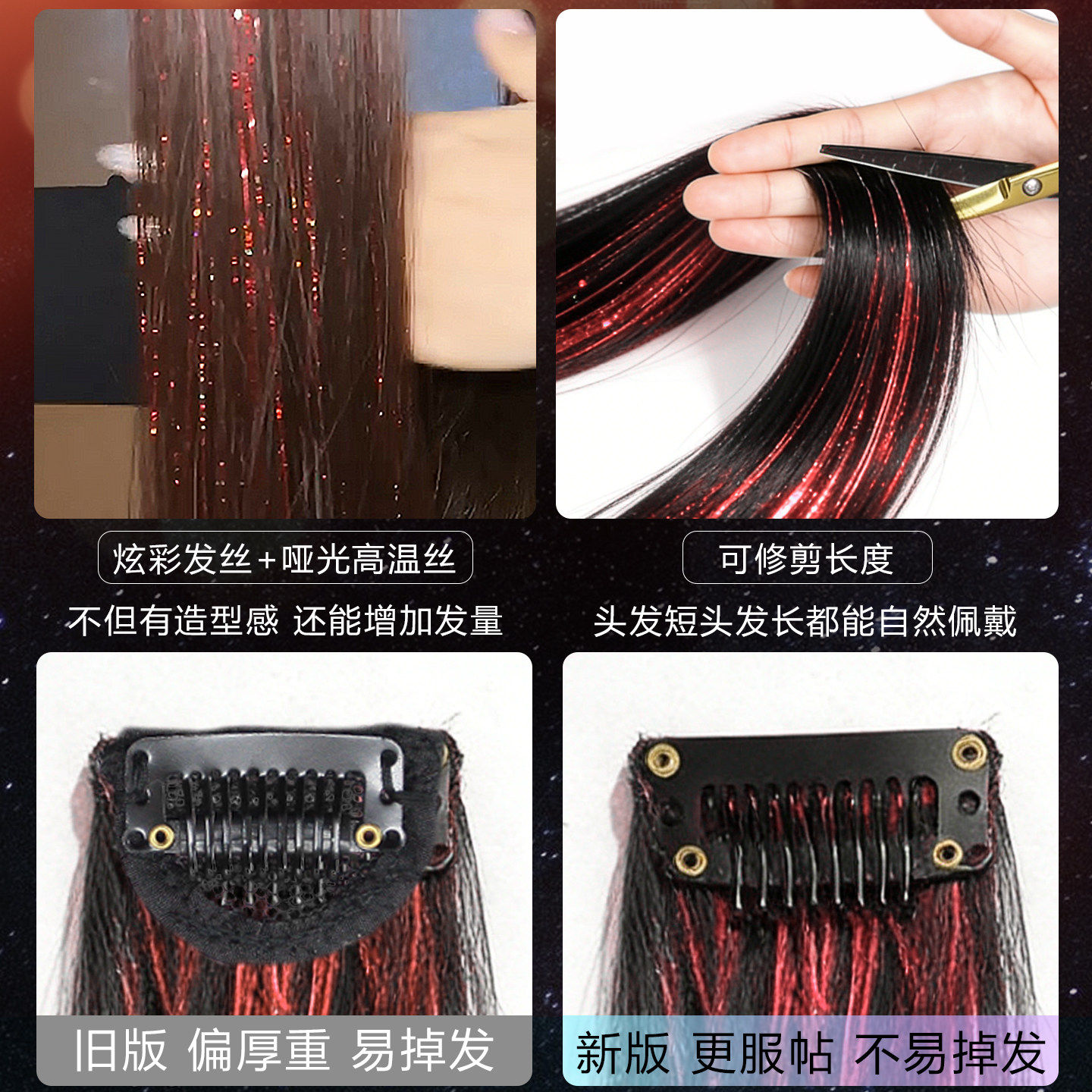 镭射发丝假发片女炫彩闪耀红色挑染辣妹挂耳染彩色亮丝舞台长发饰