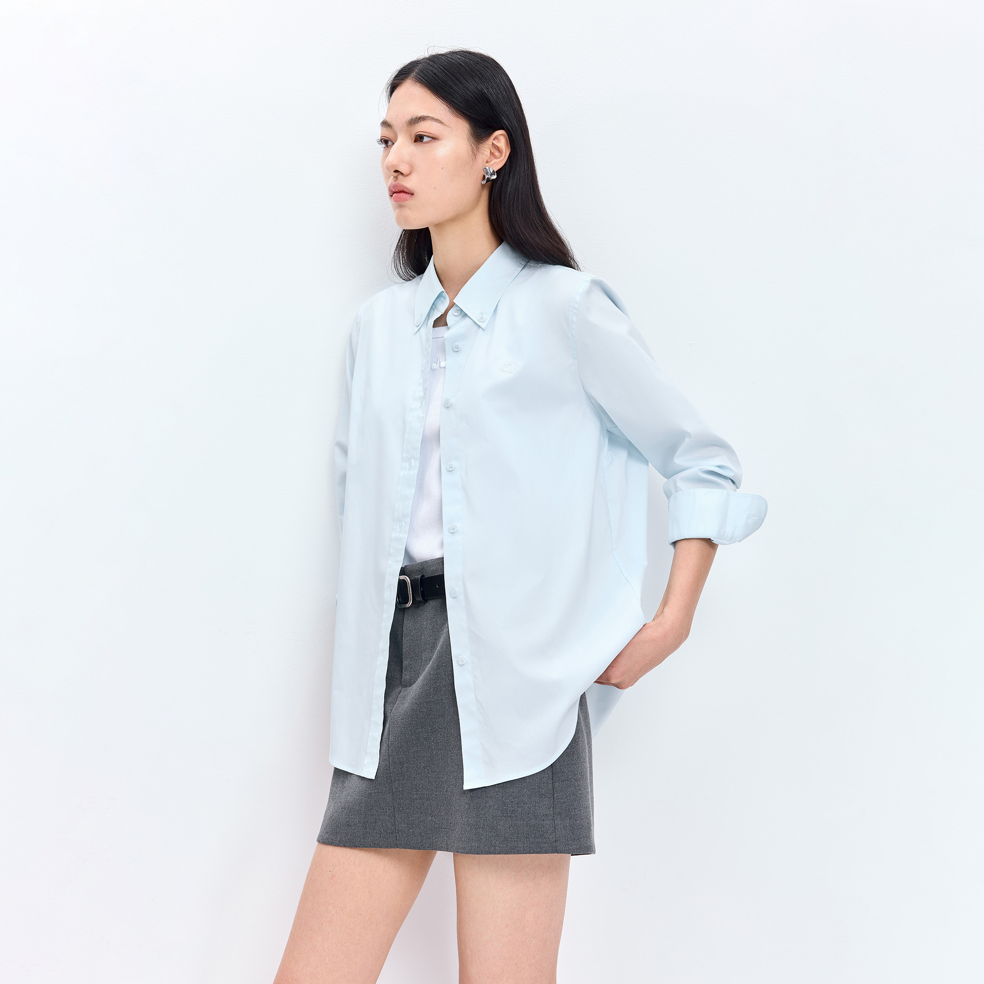 LILY2026春新款女装简约翻领正肩微宽松休闲通勤浅色长袖衬衫外套