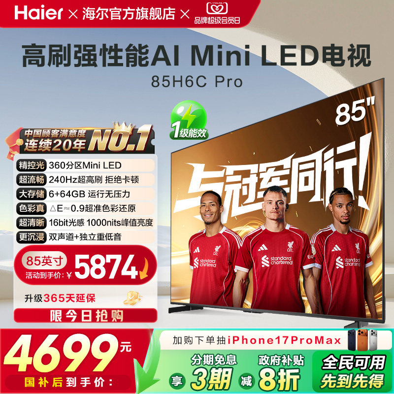 海尔电视85H6C Pro新款85英寸MiniLED液晶电视机家用以旧换新补贴