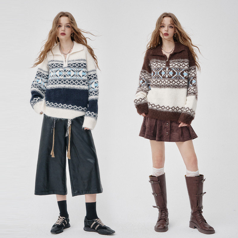 妖精的口袋复古翻领费尔岛毛衣女2025冬新款仿羊驼毛慵懒新年穿搭