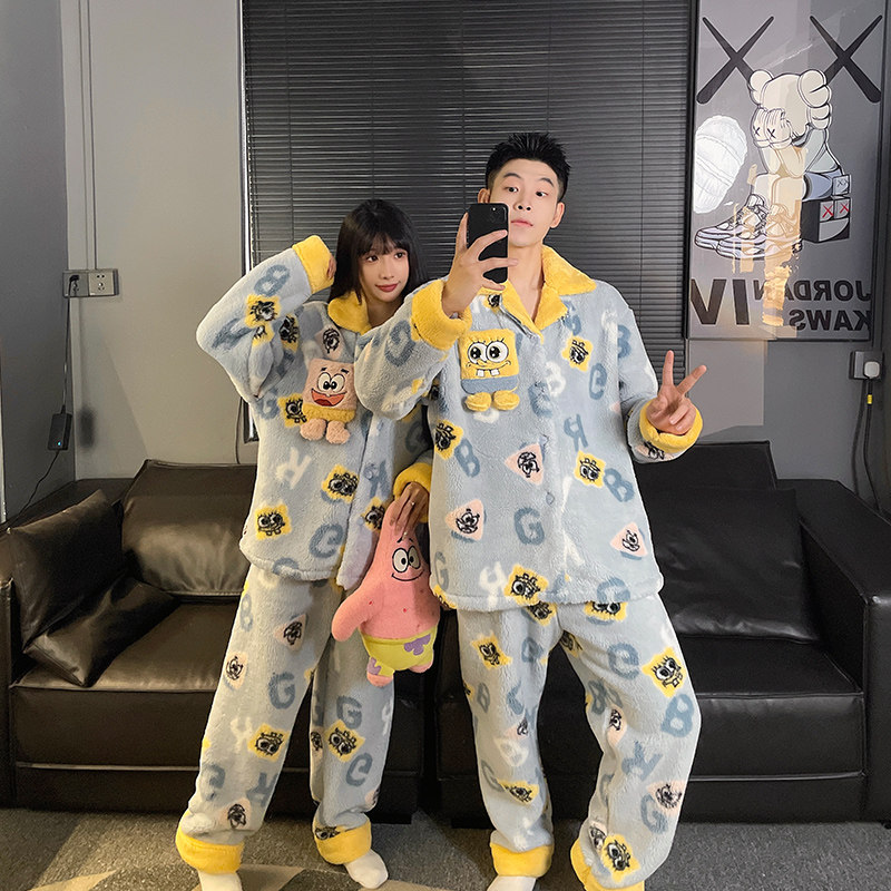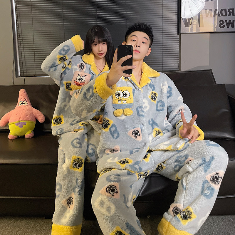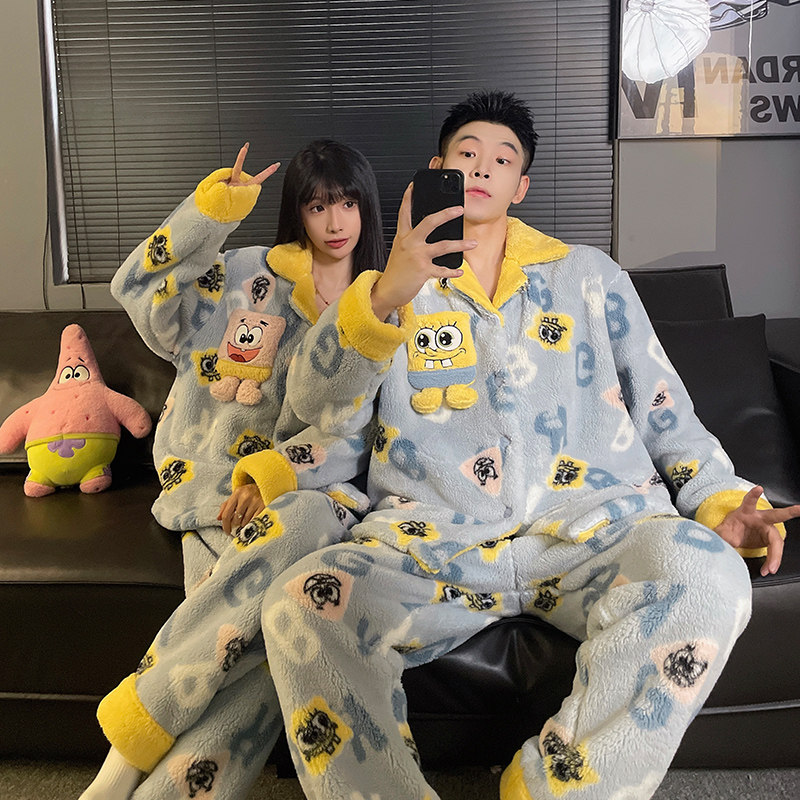 秋冬季海绵宝宝情侣睡衣女款珊瑚绒加绒加厚卡通可爱家居服可外穿