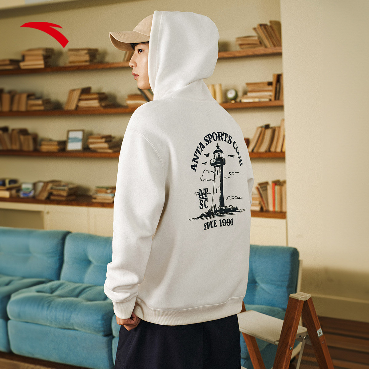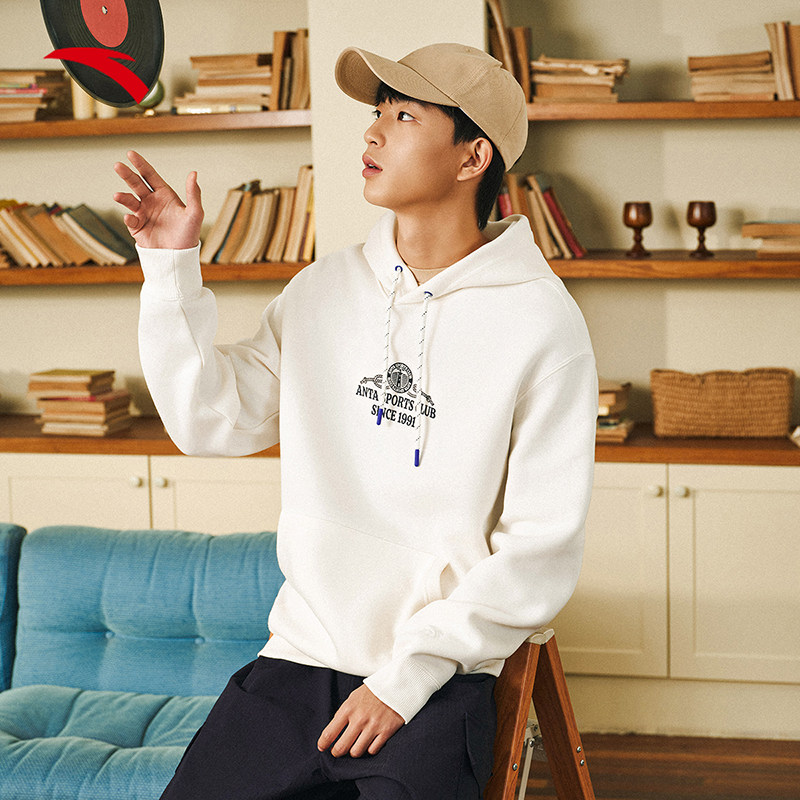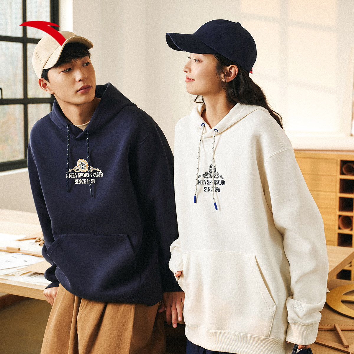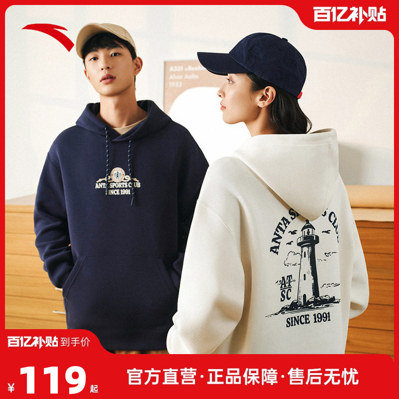 安踏加绒连帽卫衣男冬季美式保暖宽松套头运动上衣男女同款