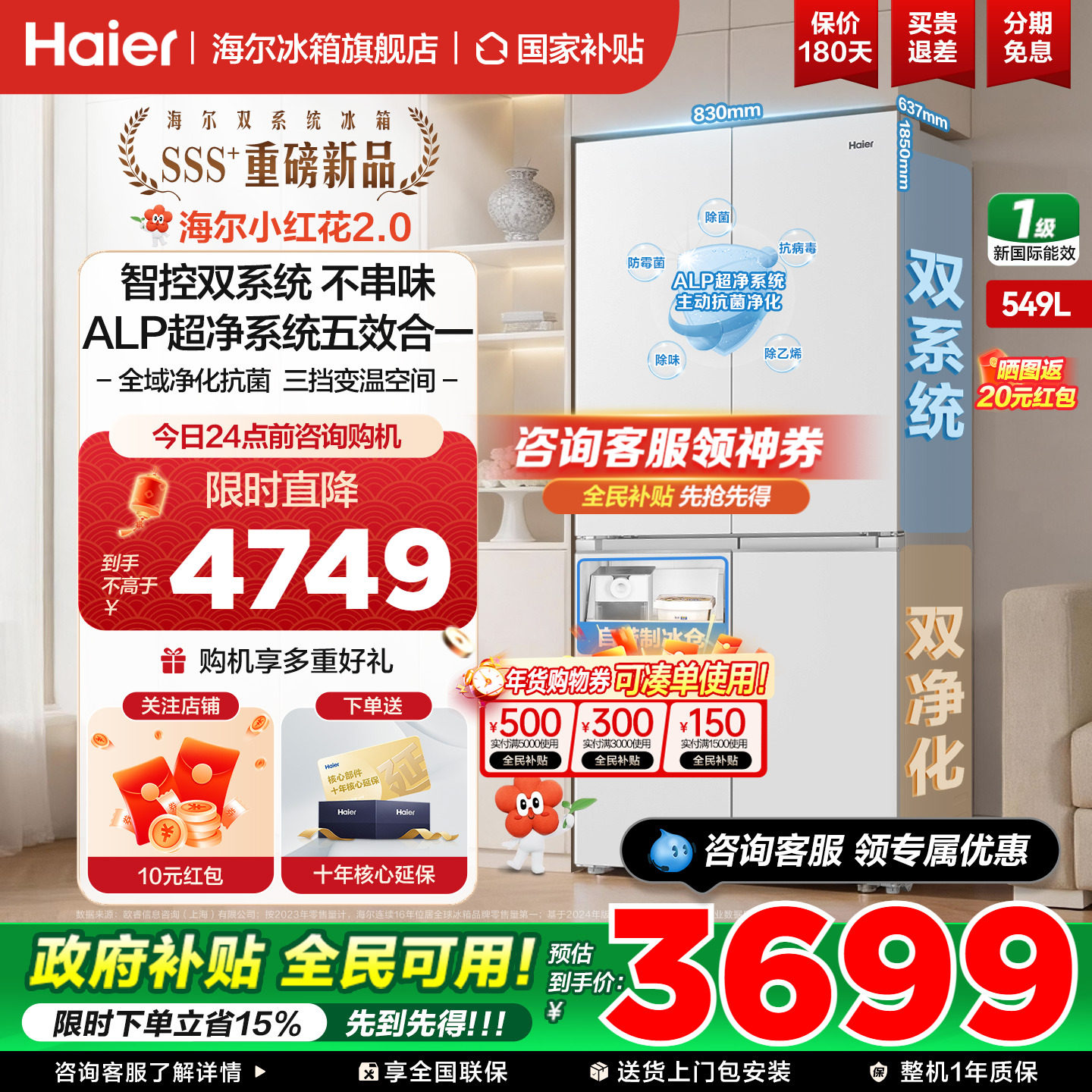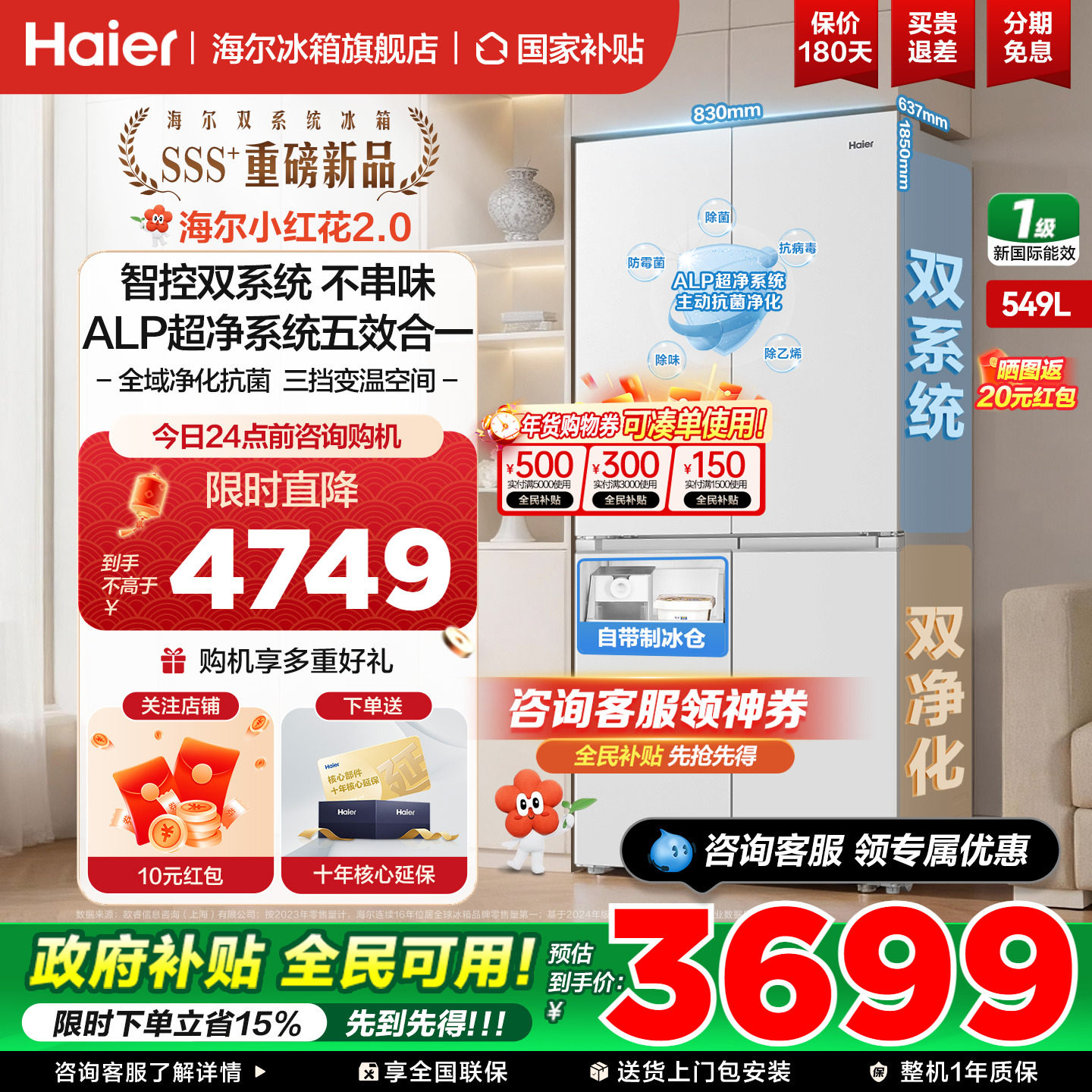【预售】海尔双系统小红花549升十字四门大容量冰箱家用官方正品