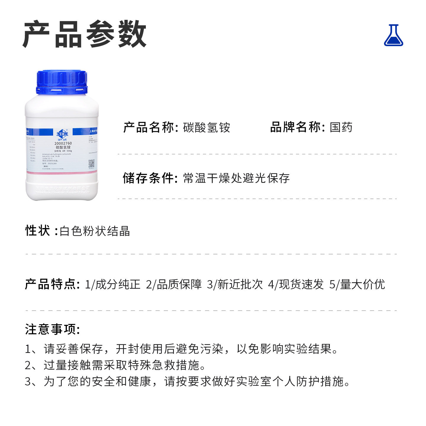 国药 碳酸氢铵 分析纯AR实验室试剂碳铵臭粉农用水溶氮肥工业发泡剂 500g/瓶