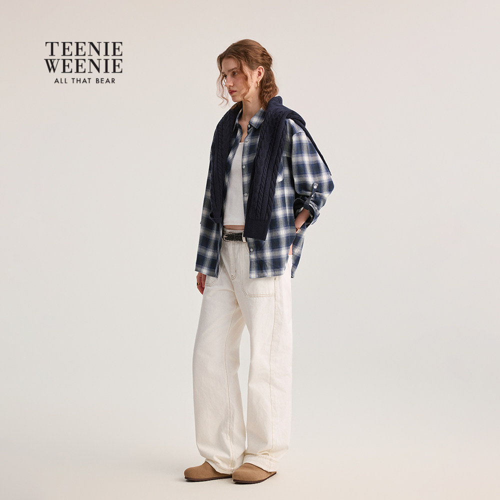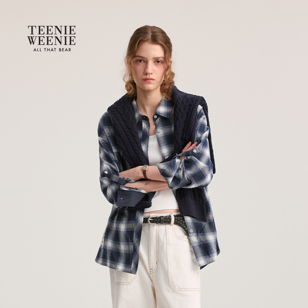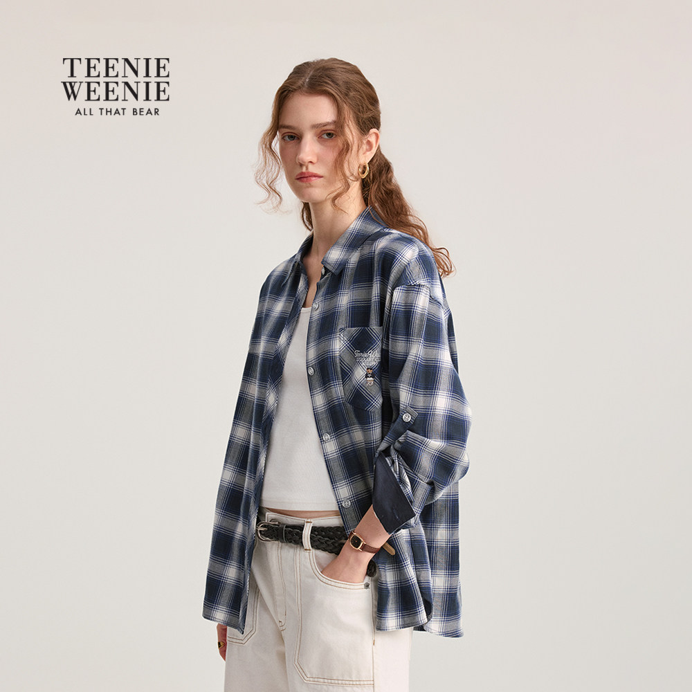 TeenieWeenie小熊女装衬衫2025年秋新款休闲宽松格纹刺绣长袖上衣