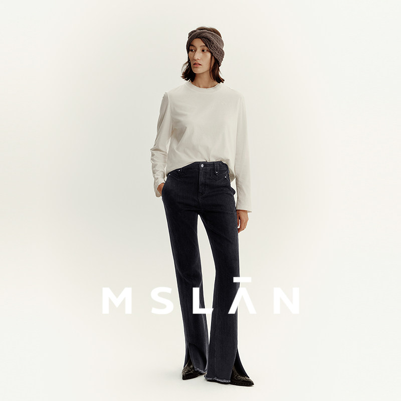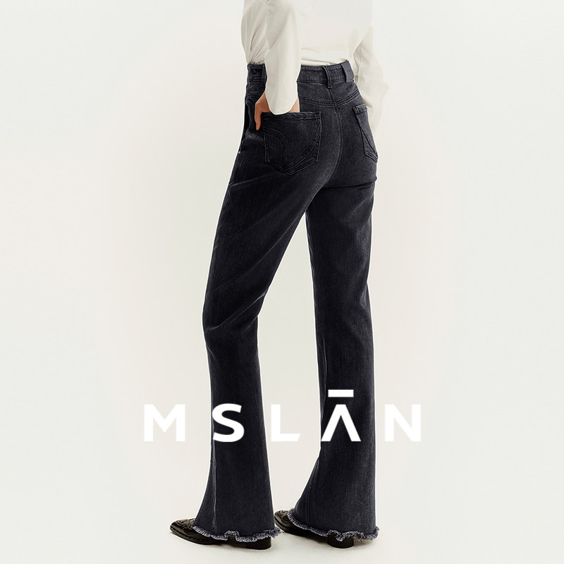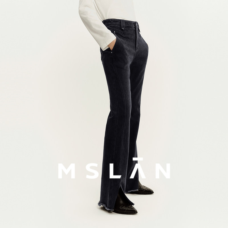 MSLAN天丝微喇裤 冬季个性分割开衩显瘦高腰毛边黑色牛仔裤女