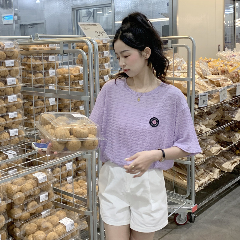 唐狮夏季短袖T恤女紫色泡泡肌理感套头圆领短袖T恤别致休闲宽松