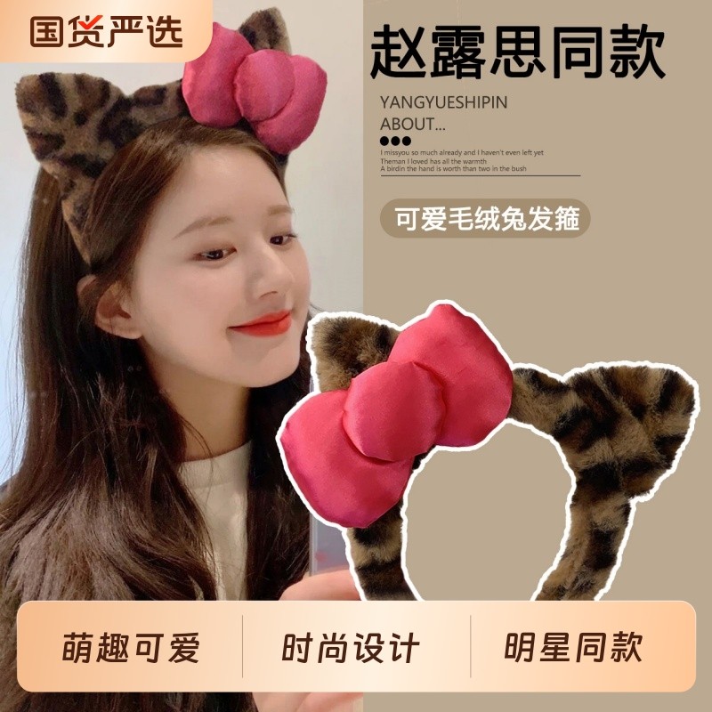 豹纹毛绒洗脸耳朵发箍女发箍新款压发可爱蝴蝶结头箍发捆发卡头饰