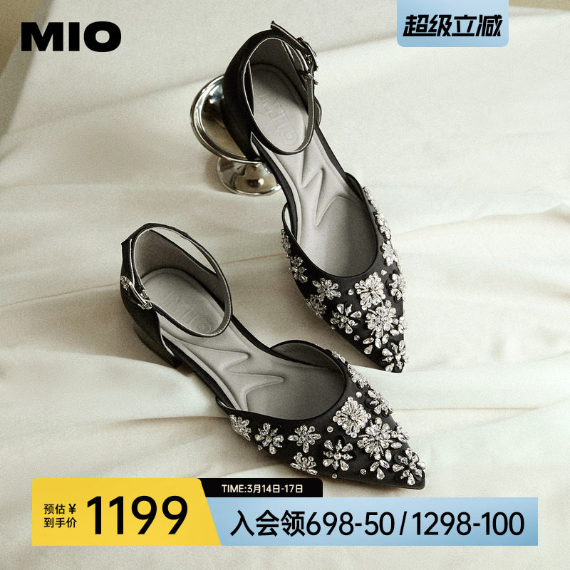 MIO米奥女鞋钻花2026夏季新款尖头一字扣单鞋低粗跟婚鞋时装凉鞋