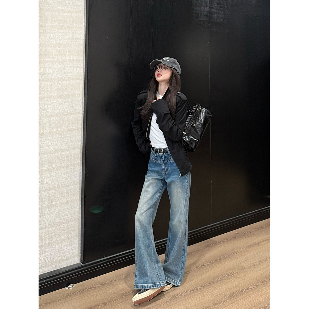 王家有鱼复古蓝微喇裤女休闲显瘦中低腰2025年秋季新款宽松牛仔裤