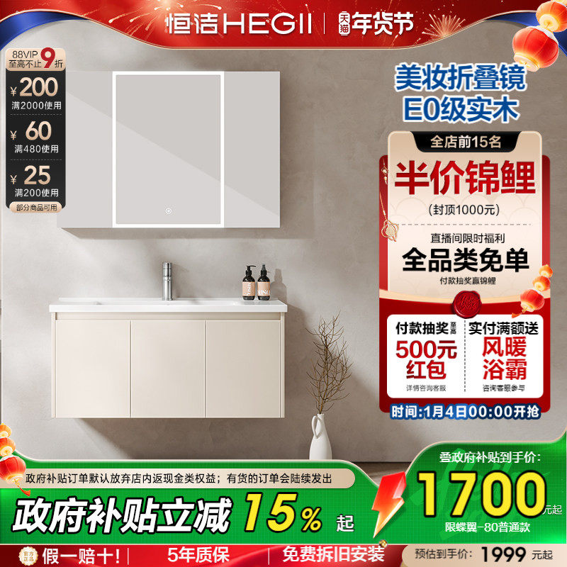 恒洁卫浴现代浴室柜陶瓷一体盆奶油风卫生间洗脸盆柜组合智能镜柜