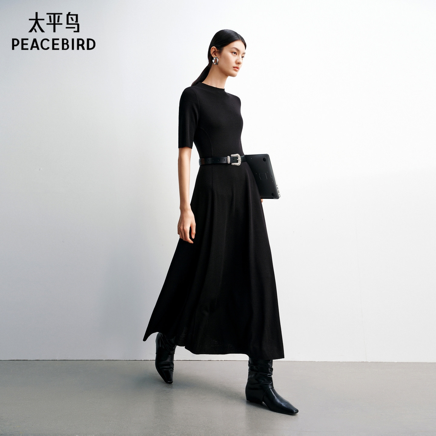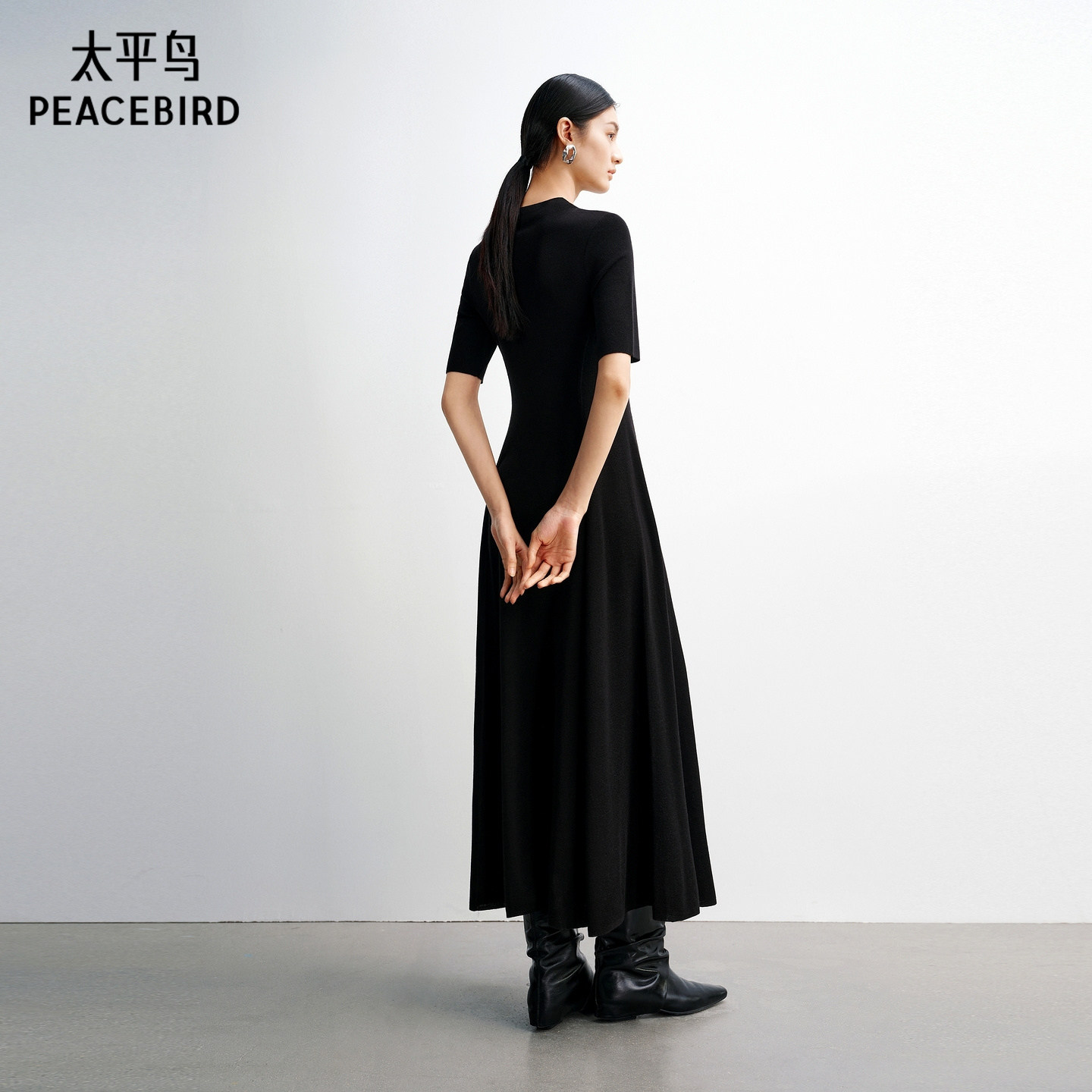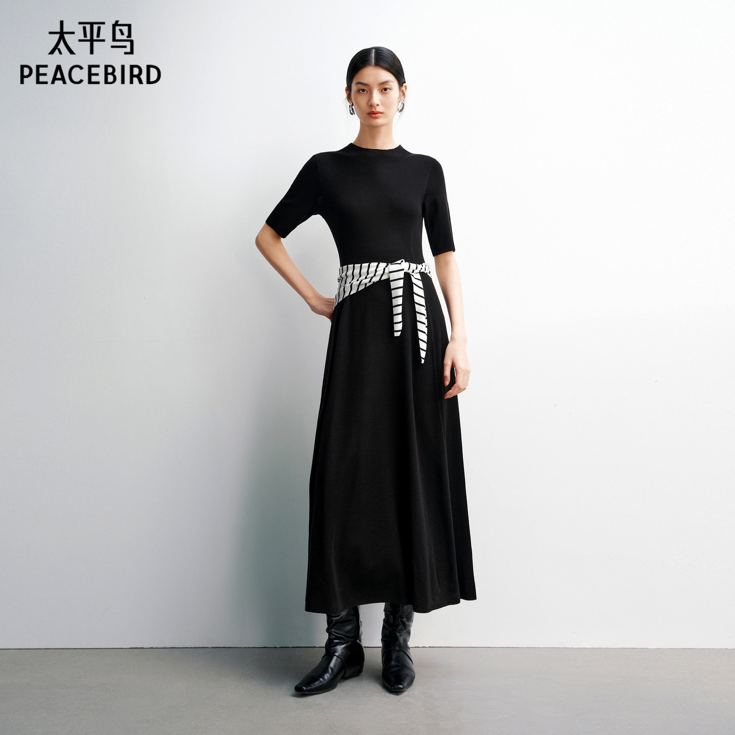 【商场同款】太平鸟短袖黑色针织通勤连衣裙女春装新款A1FAG131H