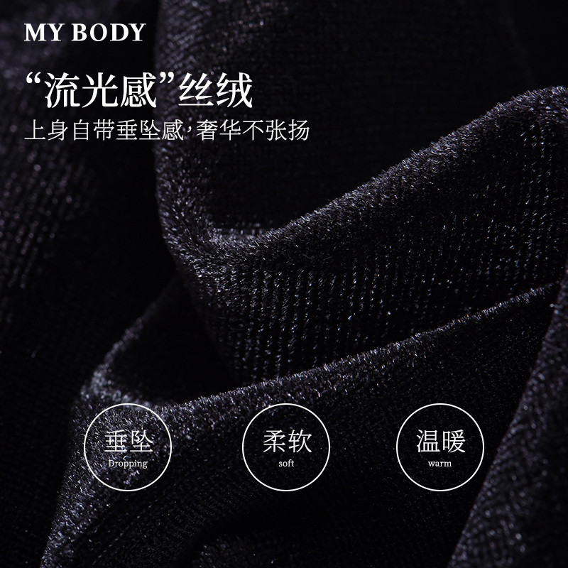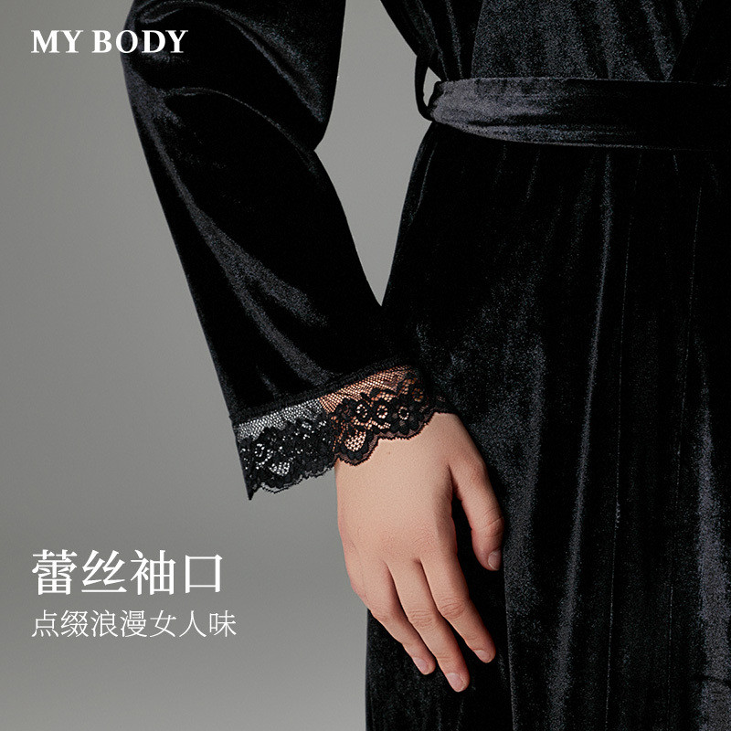 MYBODY商场同款秋季新款丝绒睡袍女性感蕾丝袖口柔软滑糯V领浴袍