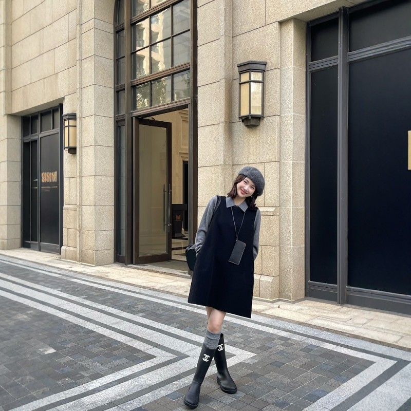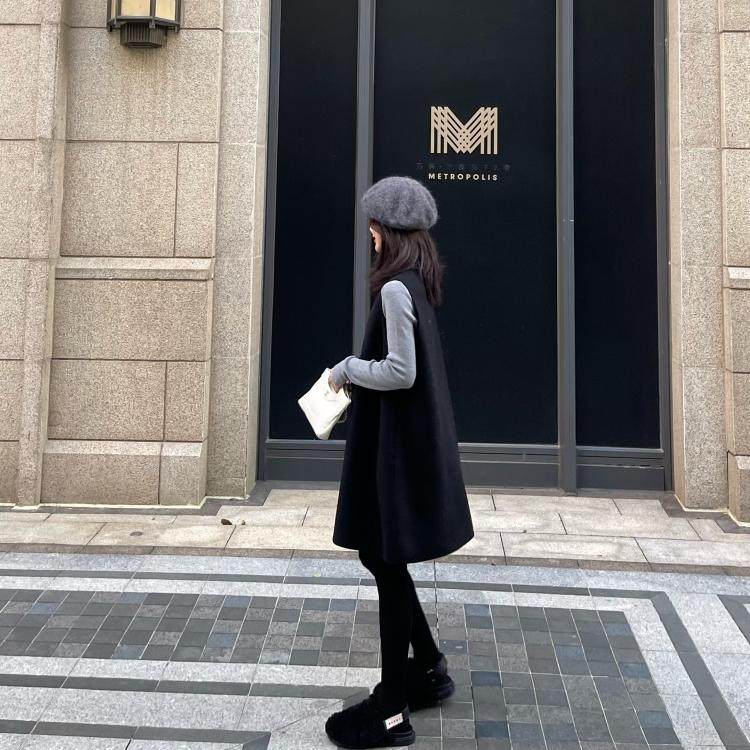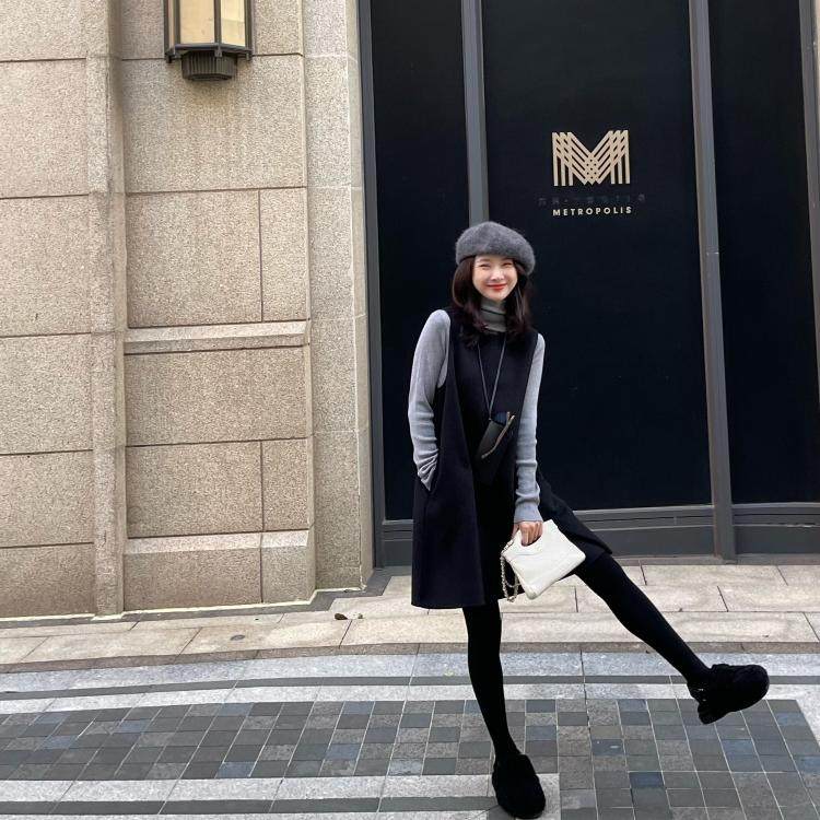 法式复古100羊毛双面尼黑色连衣裙冬季保暖显瘦背心裙