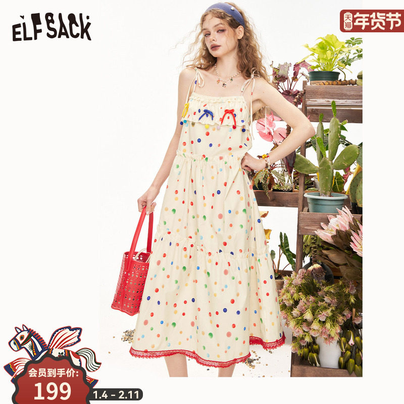 妖精的口袋彩色波点方领吊带连衣裙女2025年夏季新款收腰甜美裙子