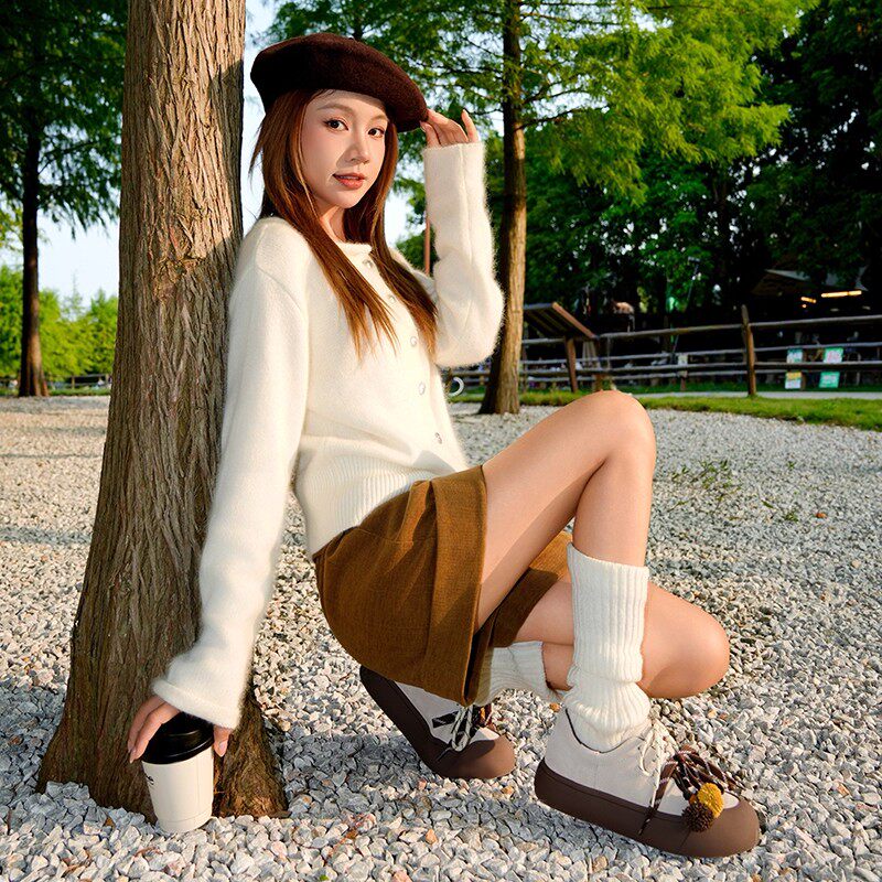 戈美其商场同款芭蕾德训鞋女2025冬季新款双鞋带加绒红色鞋子板鞋