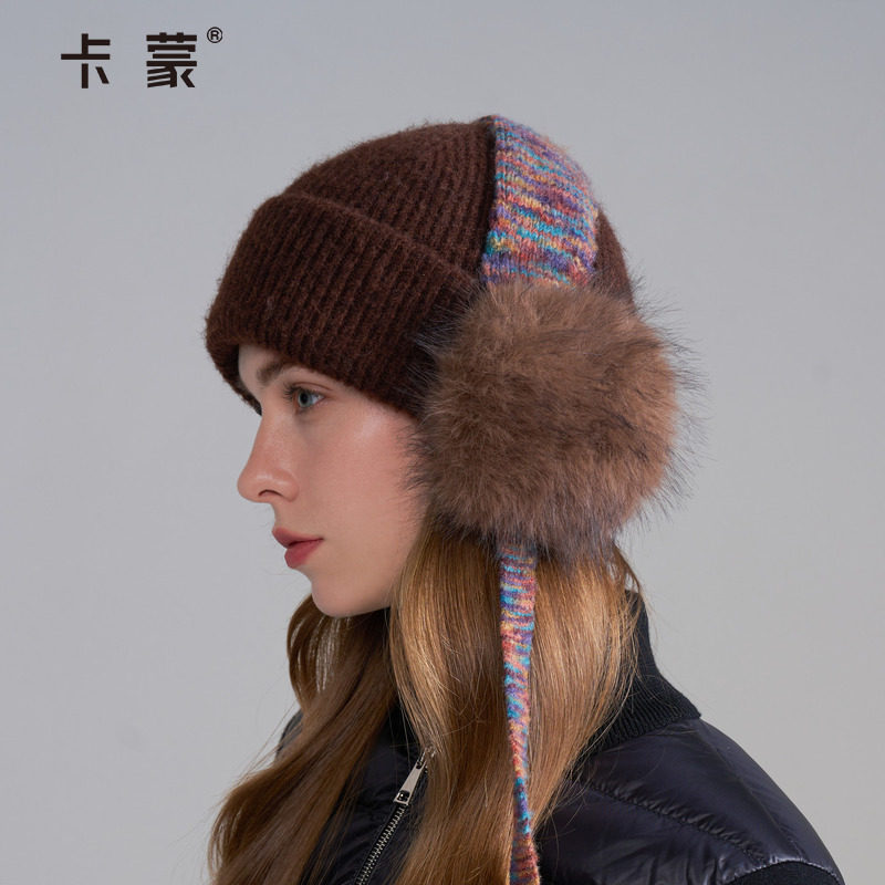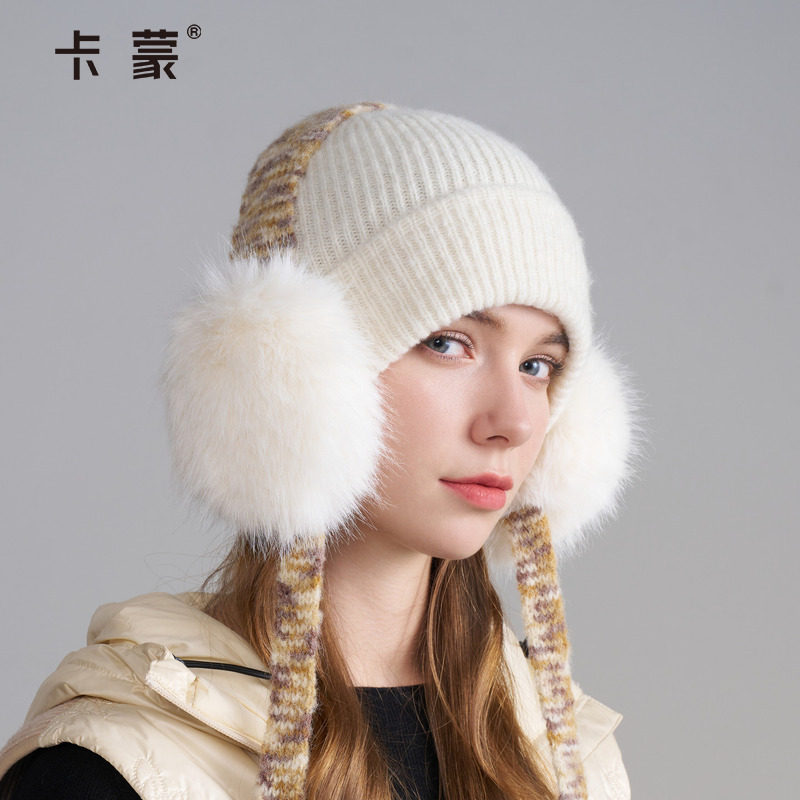 卡蒙帽子耳罩一体女士冬季保暖毛线帽防风护耳帽毛球毛线帽针织帽