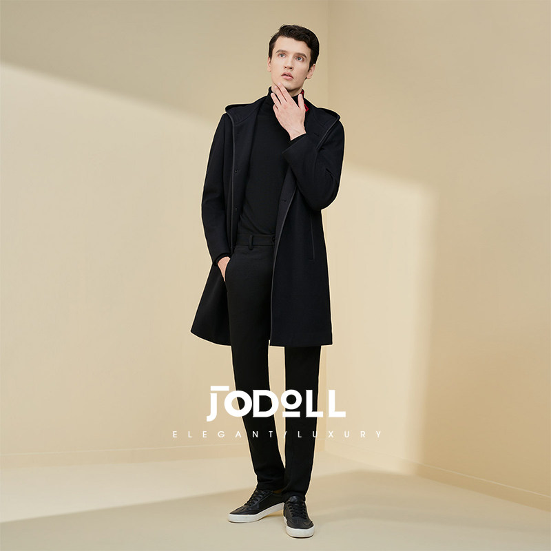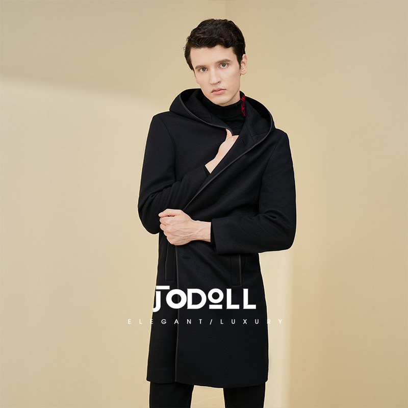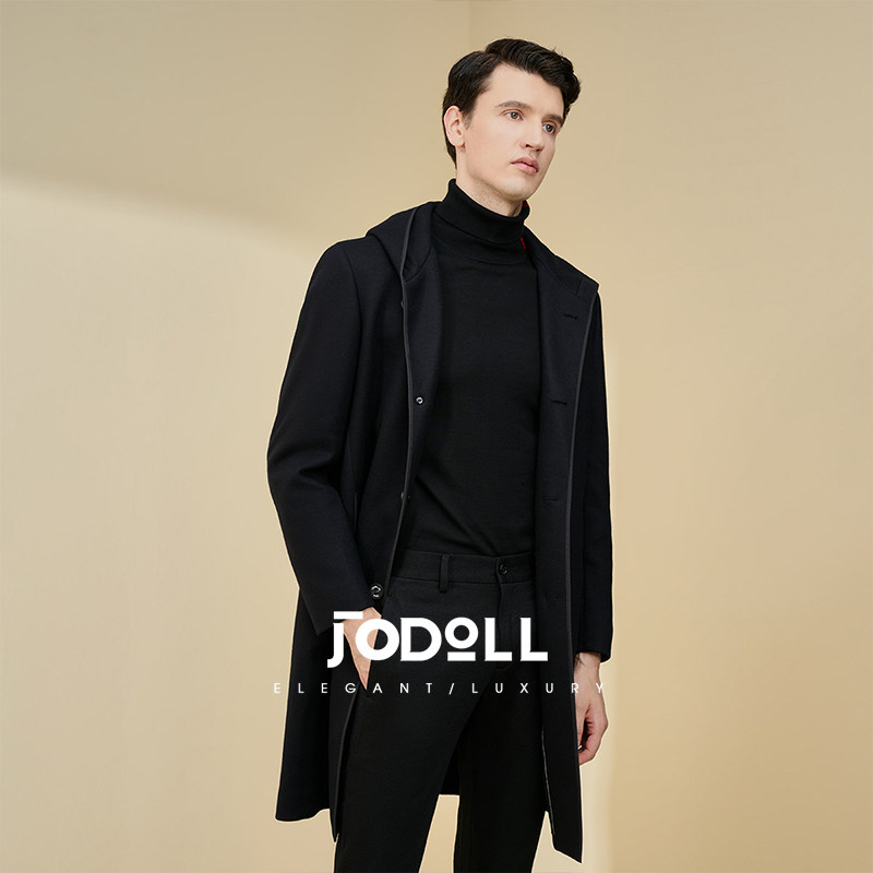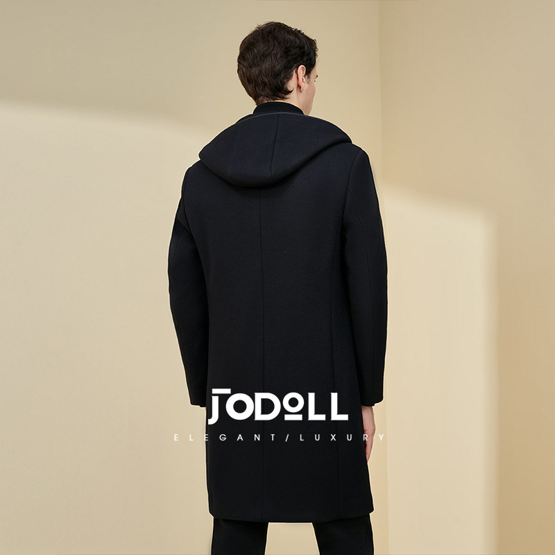 JODOLL乔顿男士中长款羊毛大衣冬季潮流休闲百搭黑色连帽毛呢外套