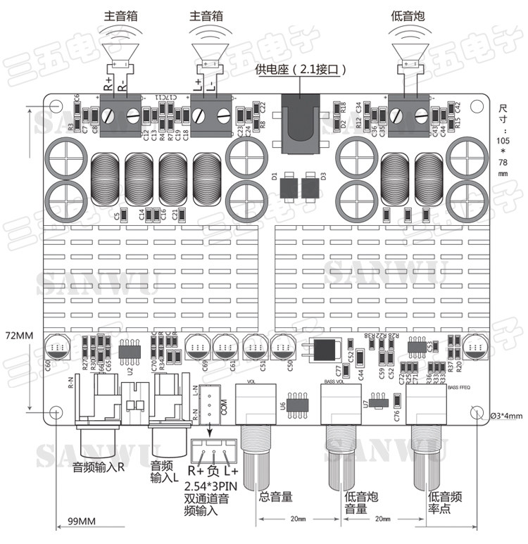 SANWU 三五电子 TPA3116 200W 2.1声道数字功放板