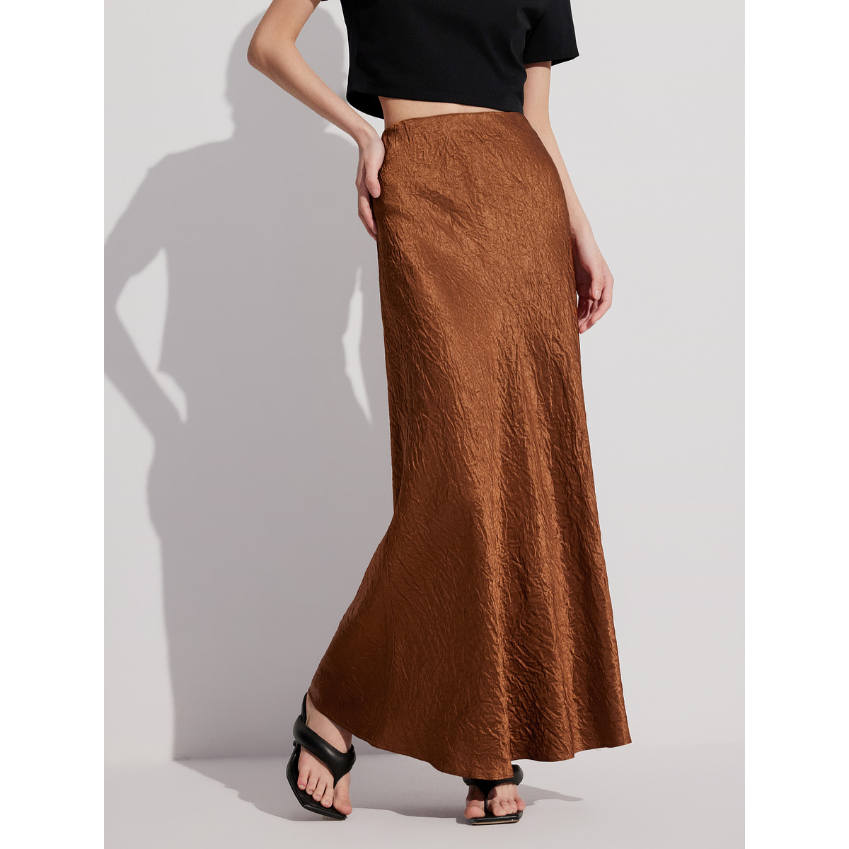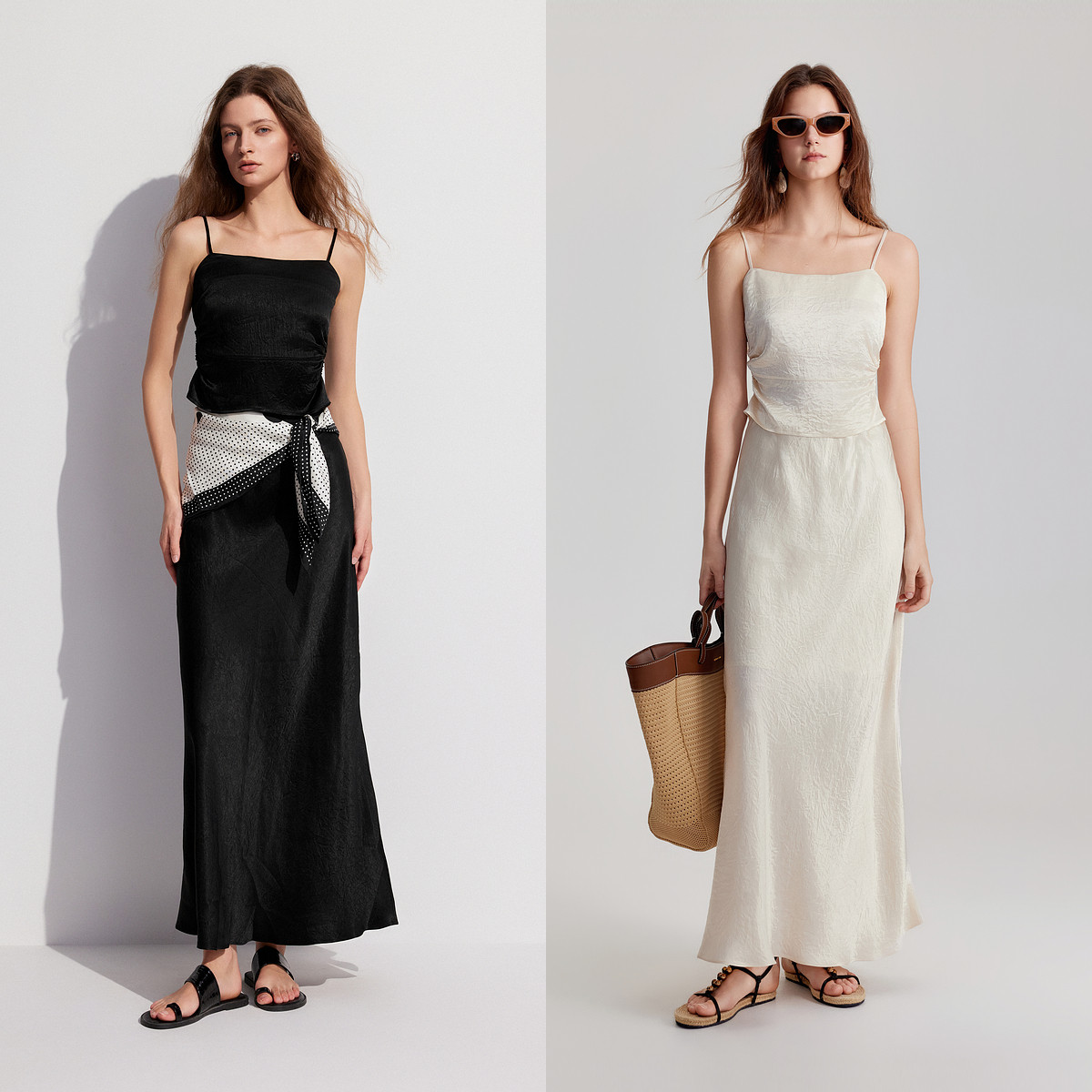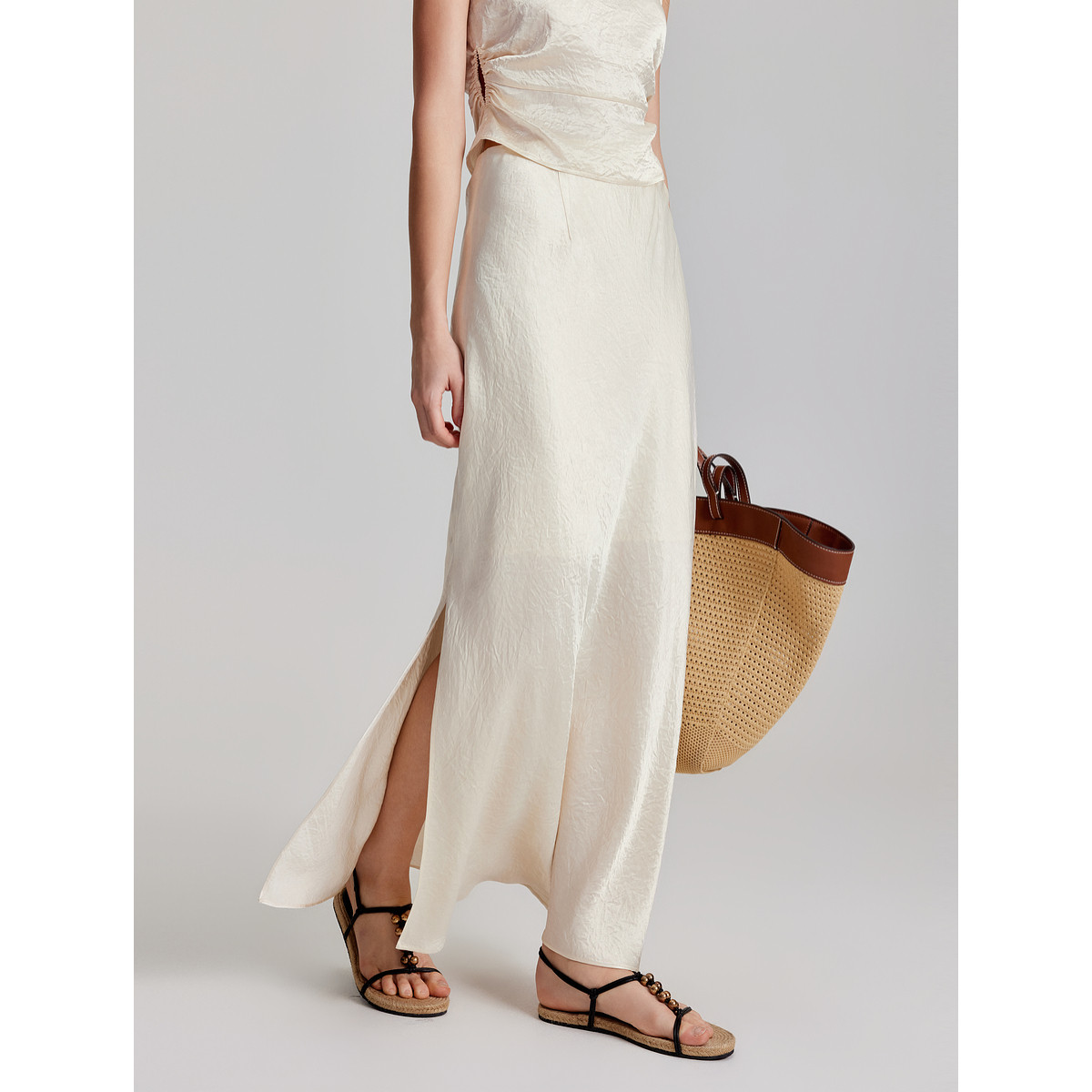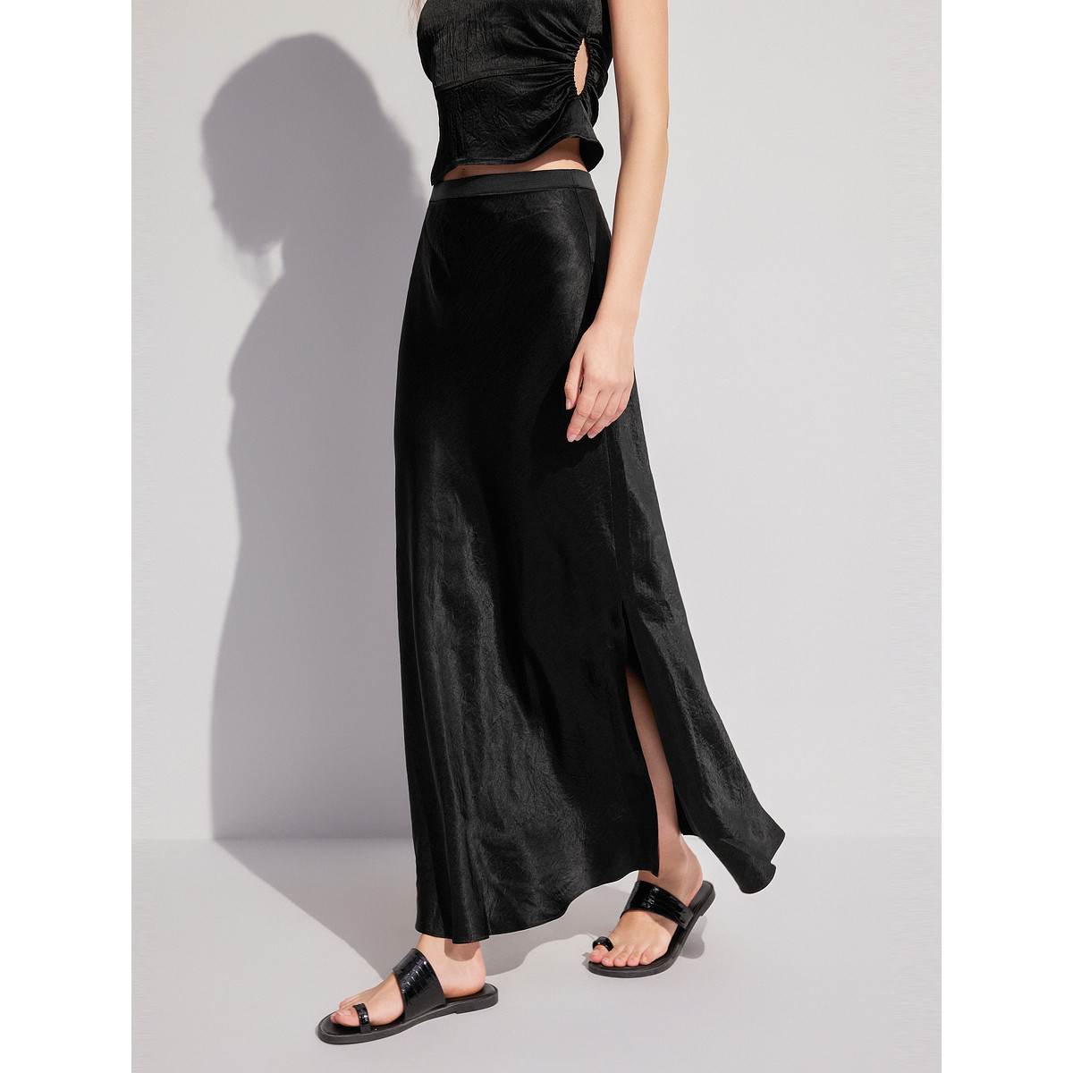 【醋酸】ELLE黑色设计感长款半身裙女2025夏季新款高腰开叉鎏光裙