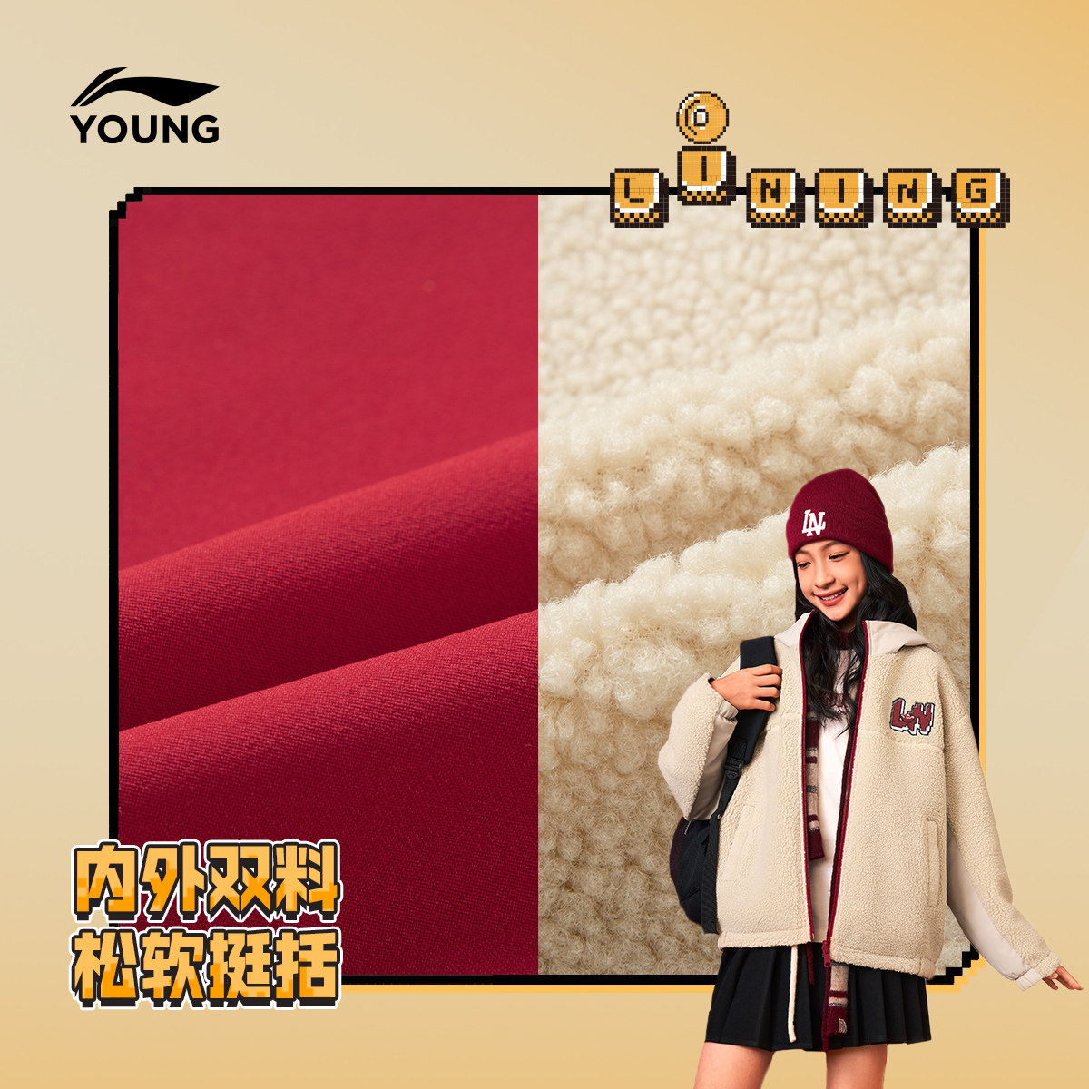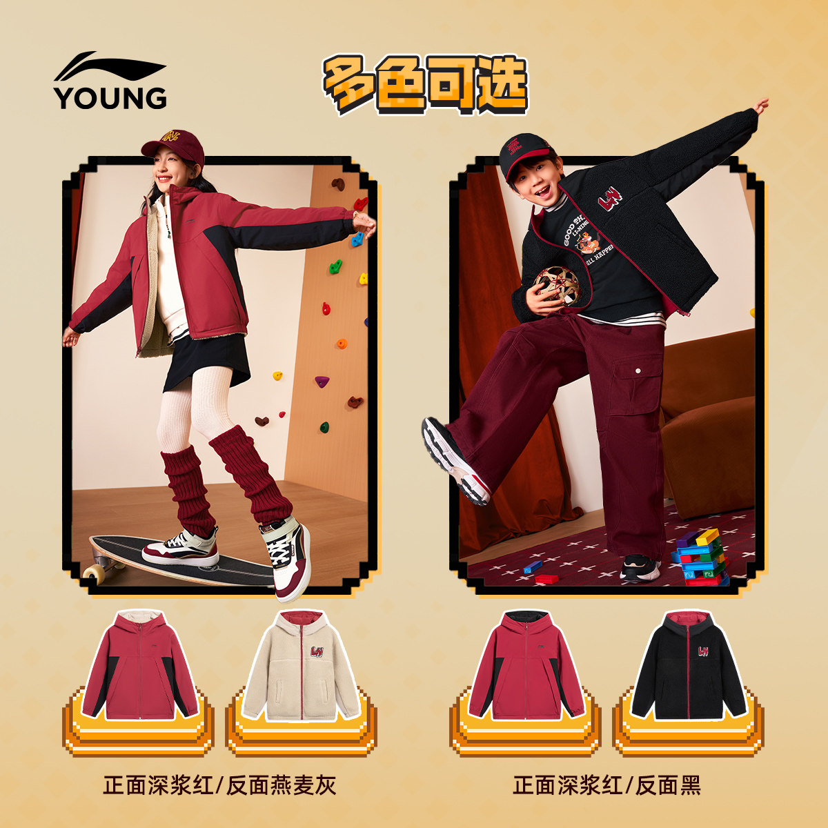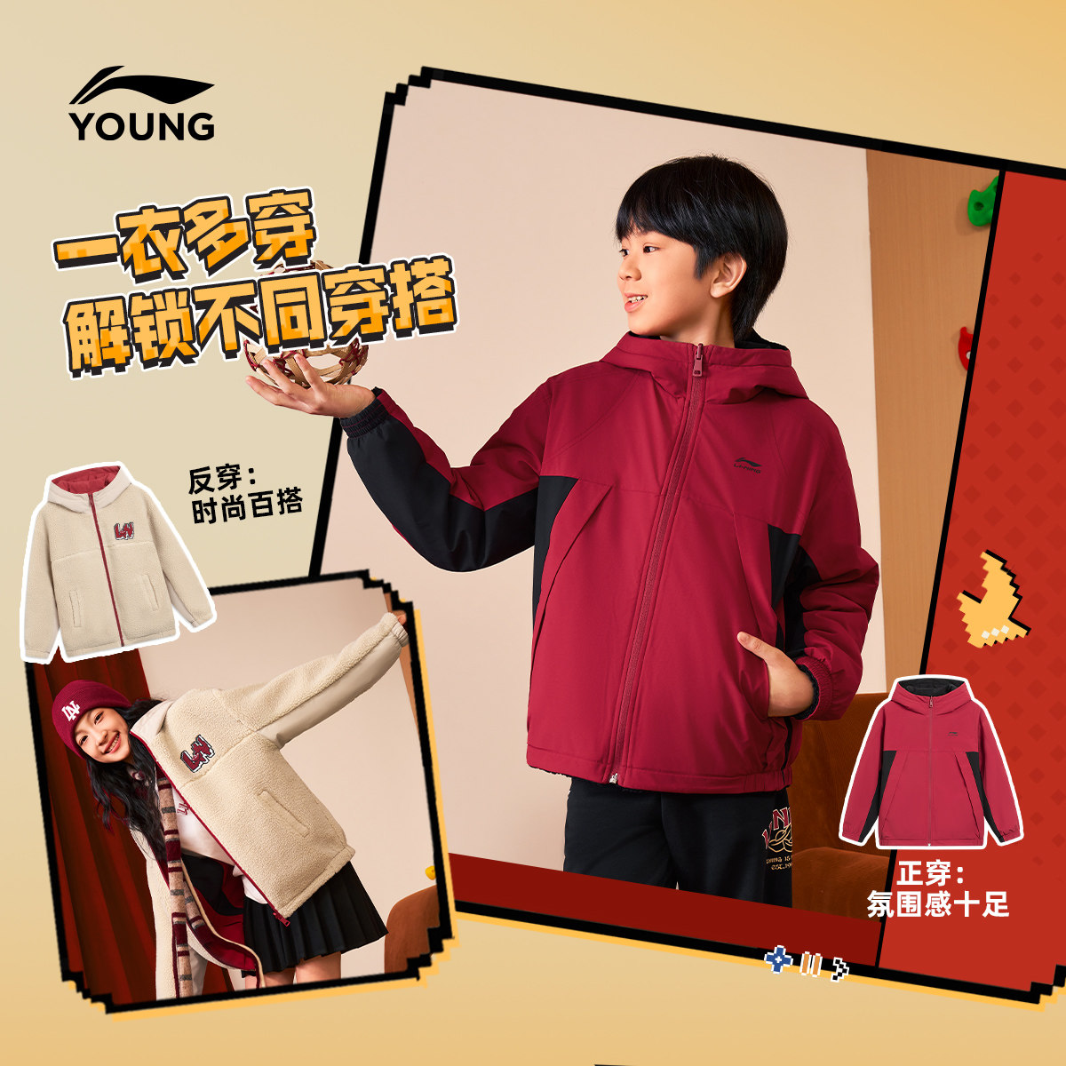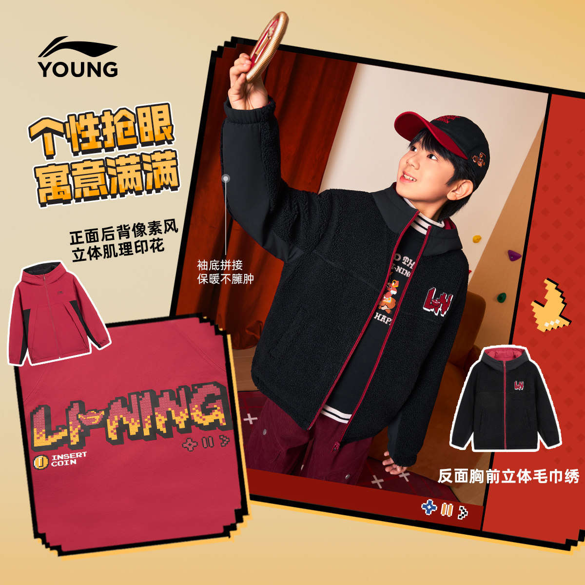 李宁童装风衣男女小大童运动生活系列宽松秋冬休闲加绒保暖童装