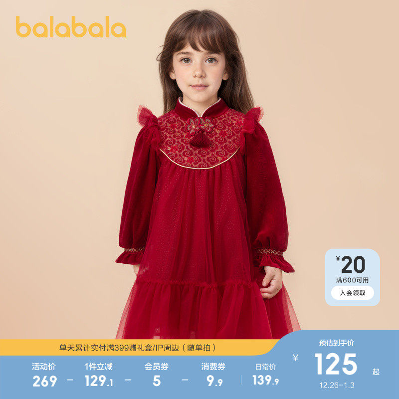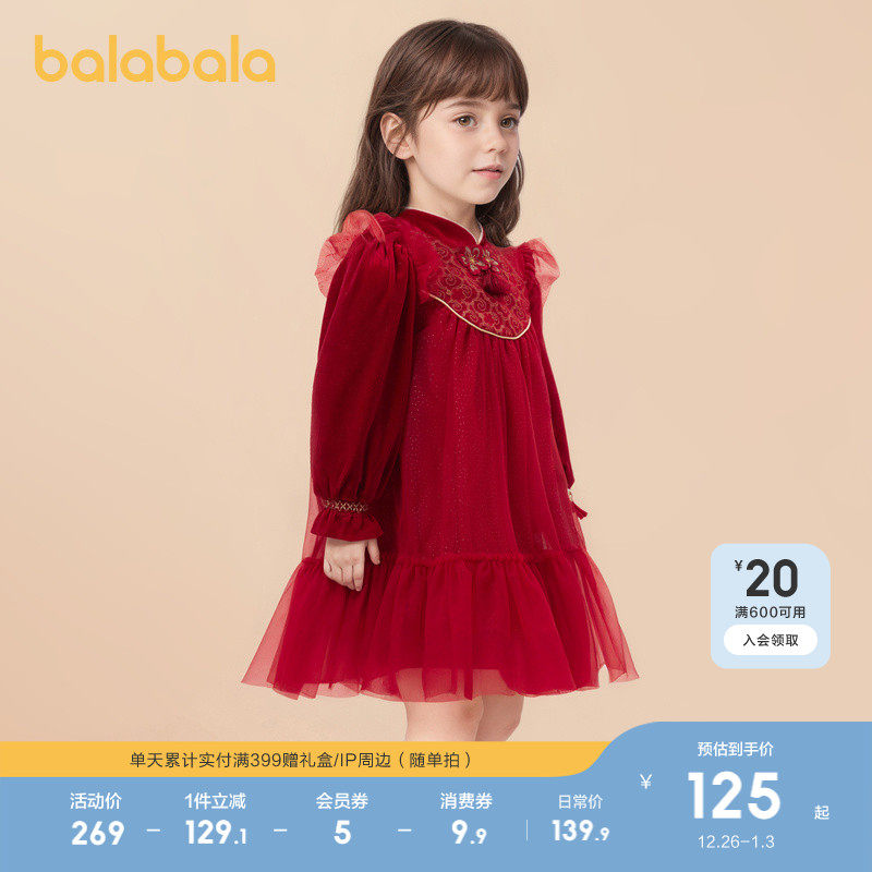 巴拉巴拉童装女童国风连衣裙小童演出服甜美网纱公主裙红色拜年服