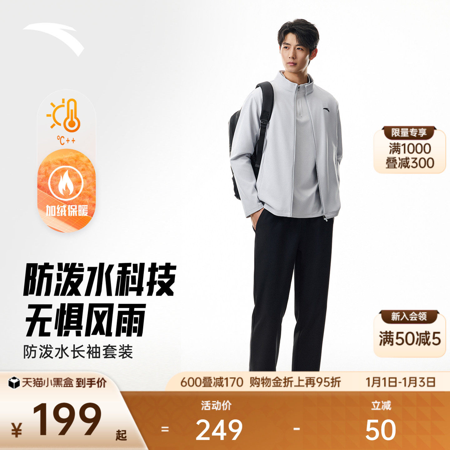 安踏长袖运动套装男士2025冬季新款防泼水立领外套运动长裤两件套
