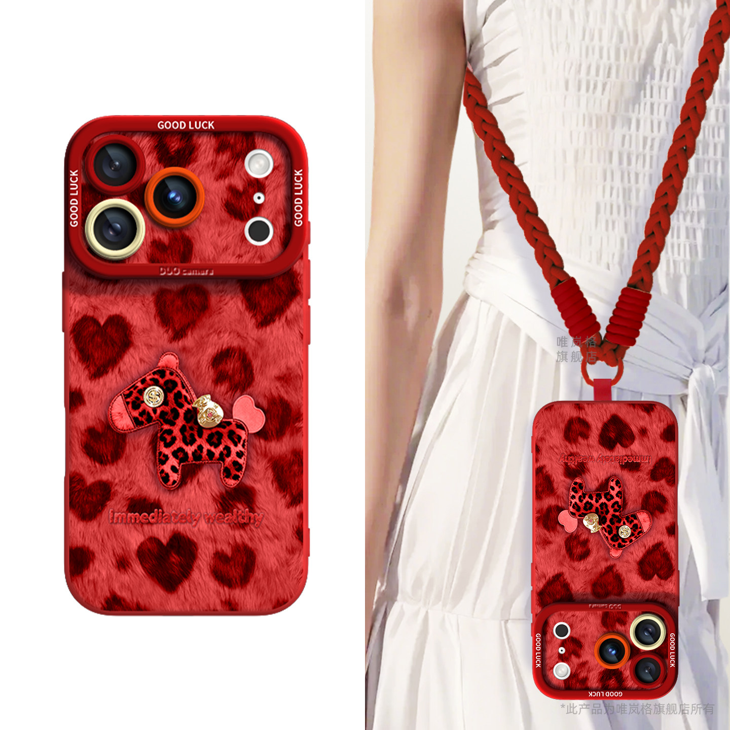 【进口液态硅胶】红色毛绒豹纹小马适用苹果17promax手机壳iPhone17pro新年17马年air保护套2026带挂绳16女15