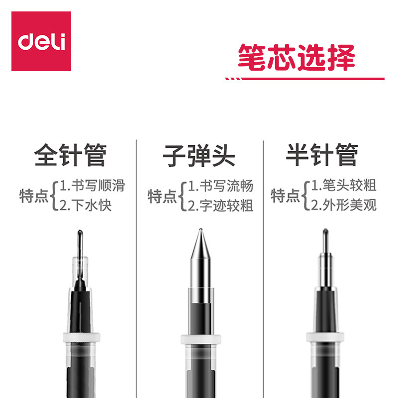 得力按动式笔芯学生专用黑色子弹头0.5mm顺滑大容量考试签字替芯