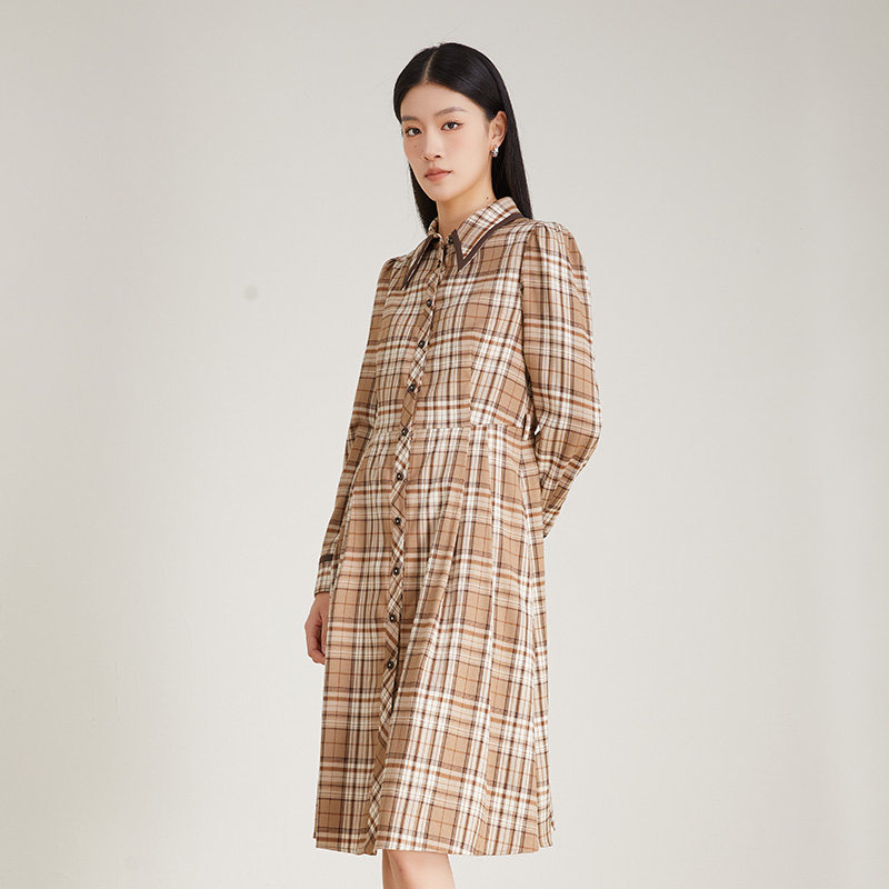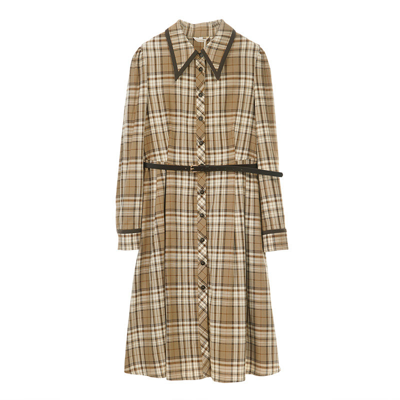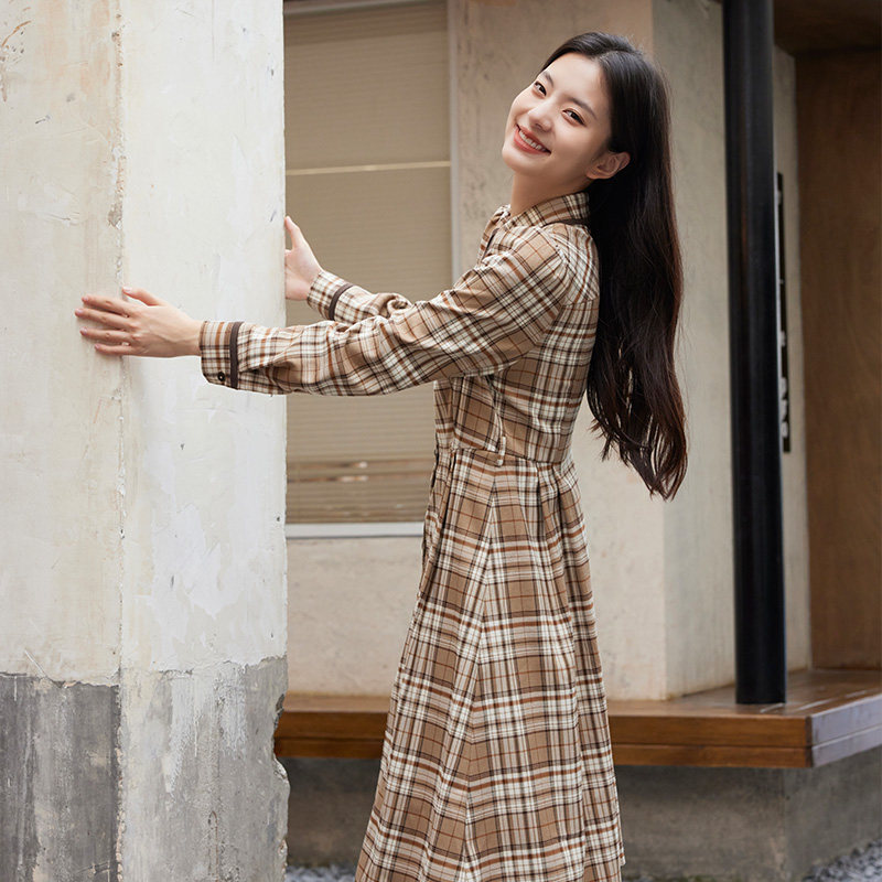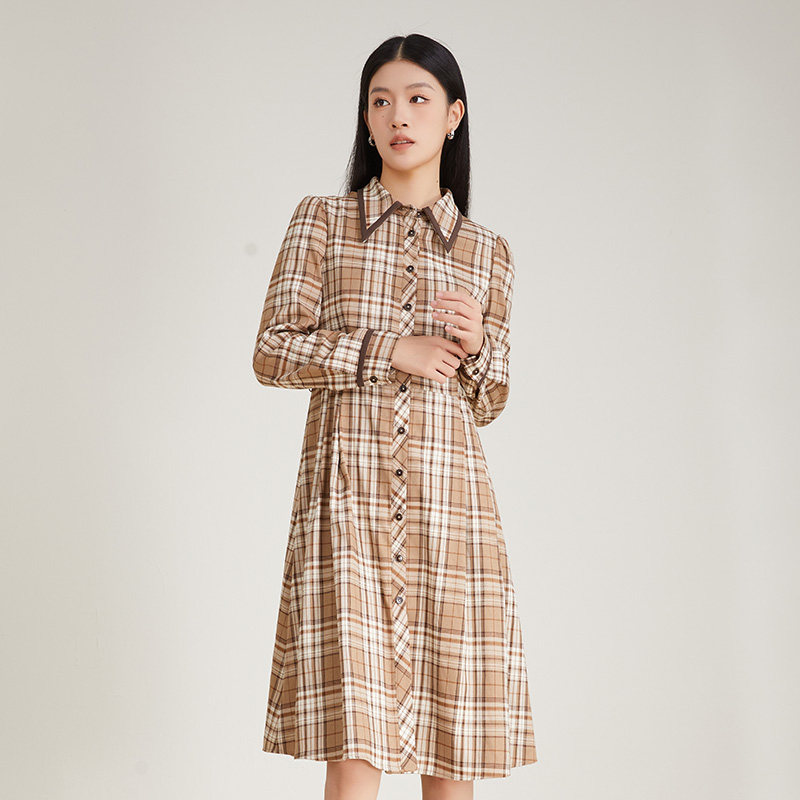 SOMSOM/索玛棉质冬季格子衬衫连衣裙女中长款通勤减龄收腰中长裙