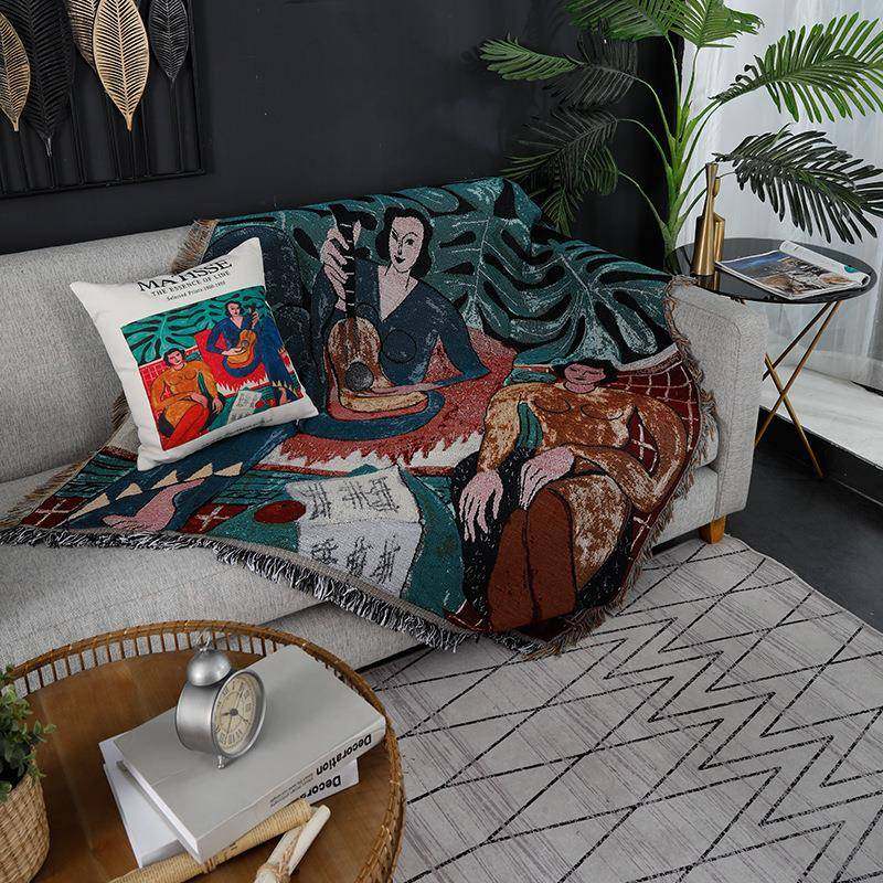 马蒂斯油画抱吉他的女孩单人位少发套罩全盖布多功能挂毯棉线毯