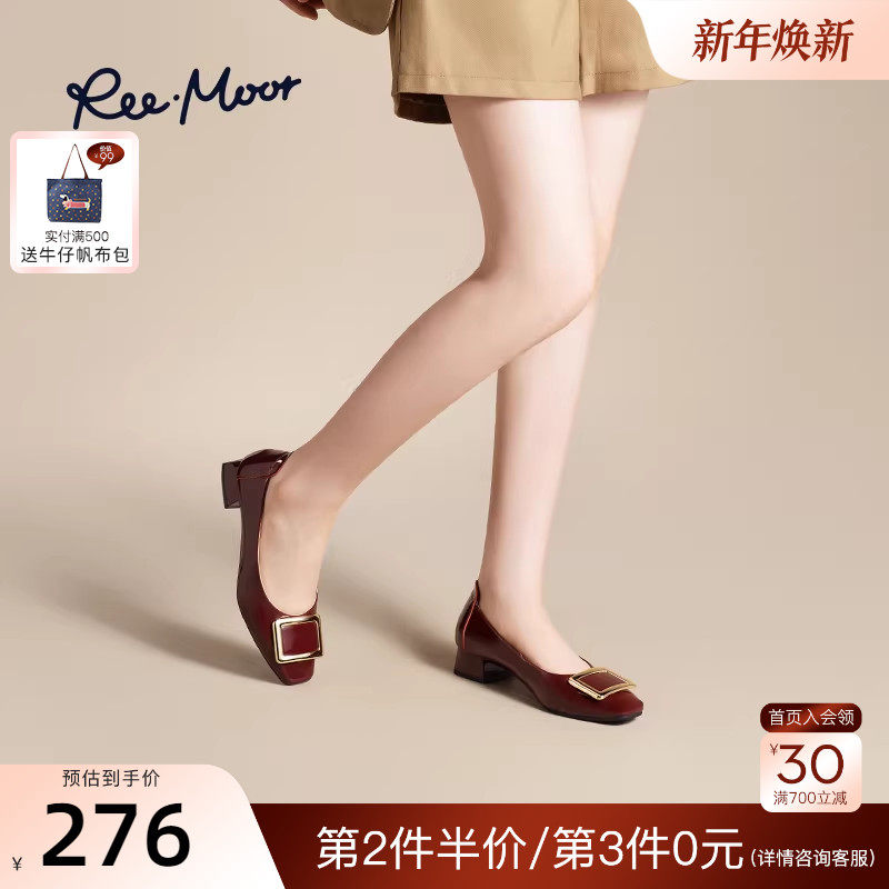 REEMOOR睿慕2025秋季新优雅中跟浅口单鞋方扣一脚蹬气质增高女鞋