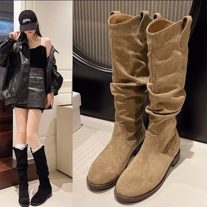 真皮~内增高粗跟骑士靴女秋冬西部靴高筒复古显瘦褶皱堆堆靴长靴