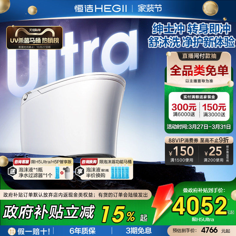 [政府补贴]恒洁智能马桶全自动智能坐便器洗护家用绅士冲H5Ultra