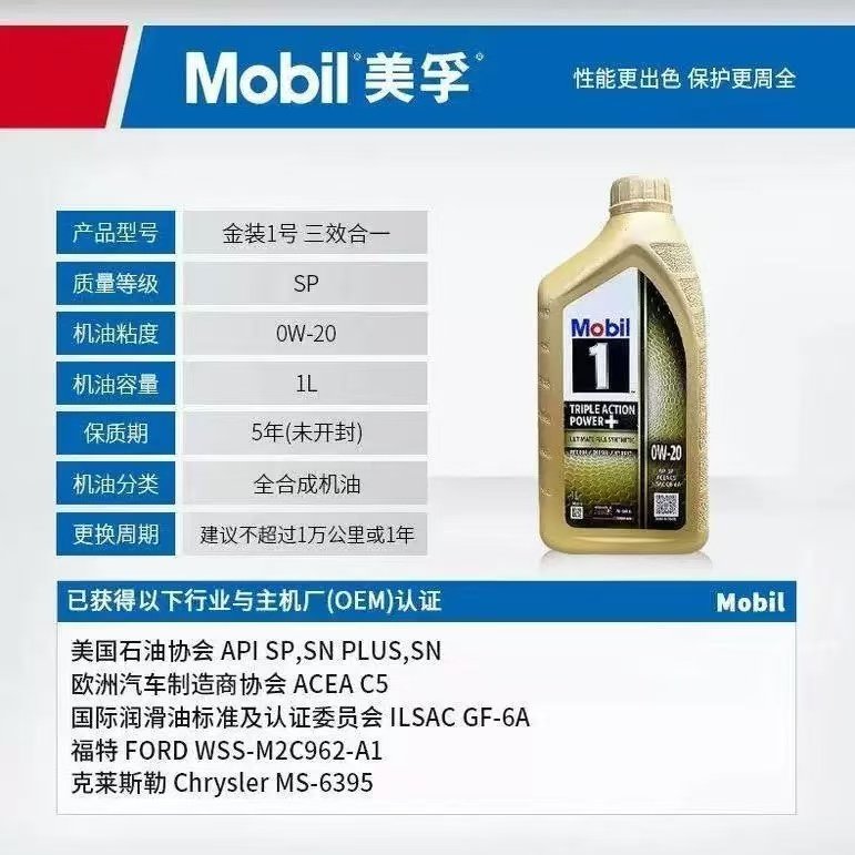 Mobil美孚一号全合成机油0W-20正品金装进口SP汽车润滑油发动机1L