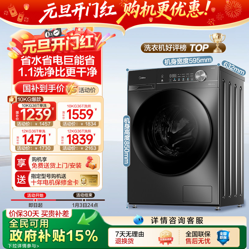 以旧换新补贴美的10/12KG滚筒洗衣机全自动家用除菌洗烘脱一体36T