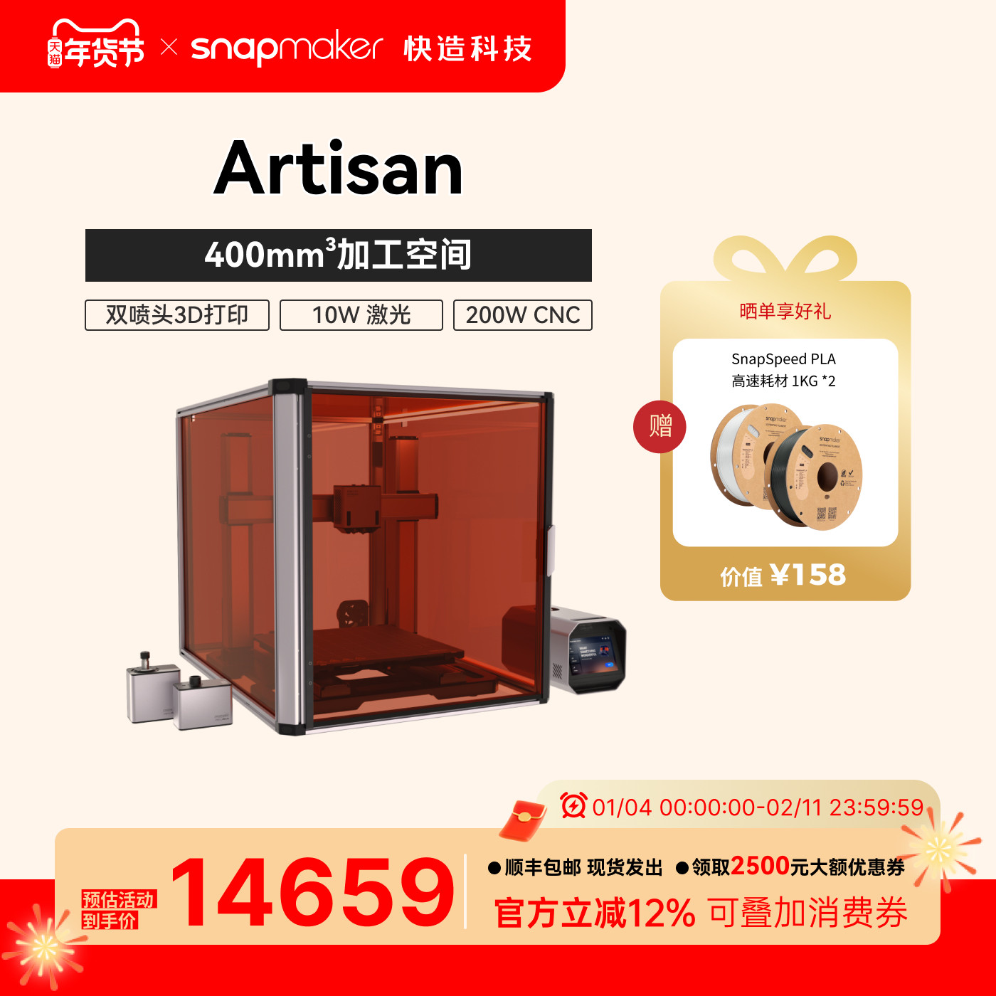 Snapmaker快造 Artisan工匠三合一单头双喷3D打印10W激光200WCNC雕刻与切割三合一3D打印机大尺寸FDM多功能
