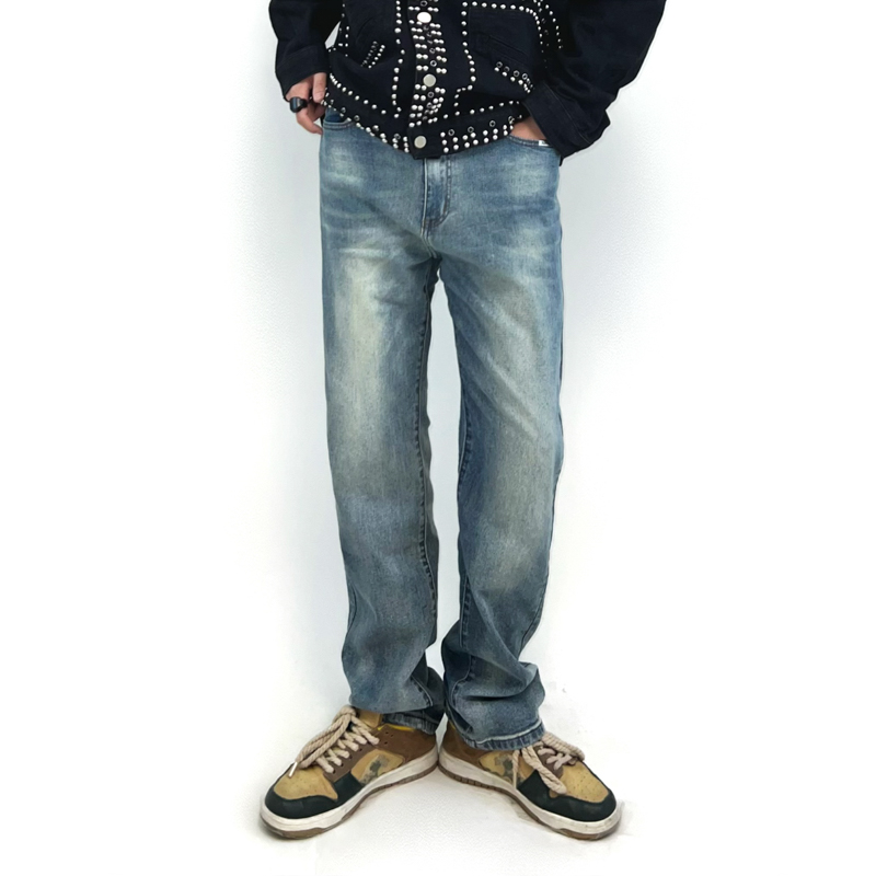 UNKNOWTAL 水洗做旧黄泥蓝浅色直筒牛仔裤弹性宽松休闲百搭长裤