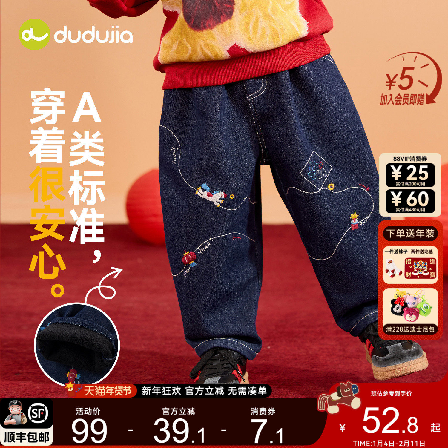 dudujia儿童牛仔裤冬季加绒加厚男童裤子冬款保暖宝宝唐装休闲裤a