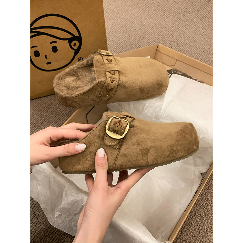 厚底包头半拖毛毛鞋女加绒豆豆勃肯鞋2025新款冬季鞋子一脚蹬棉拖